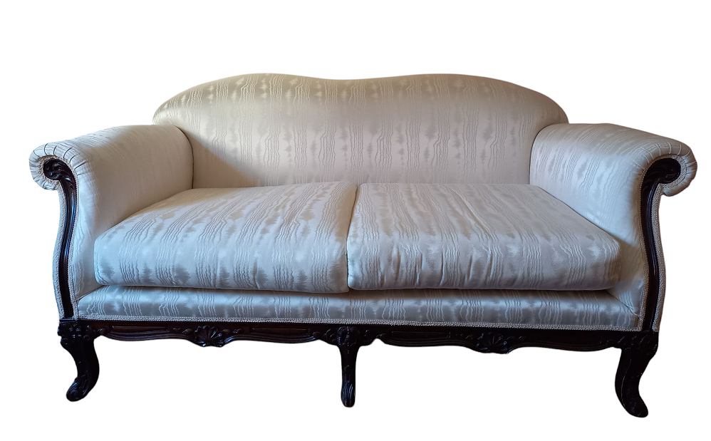 Divano in legno intagliato rivestito in tessuto bianco operato XIX secolo...