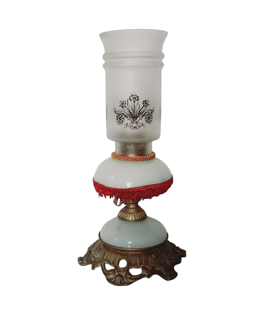 Lume a petrolio in vetro lattimo e metallo con decorazioni e applicazioni di passamanerie h.cm.34