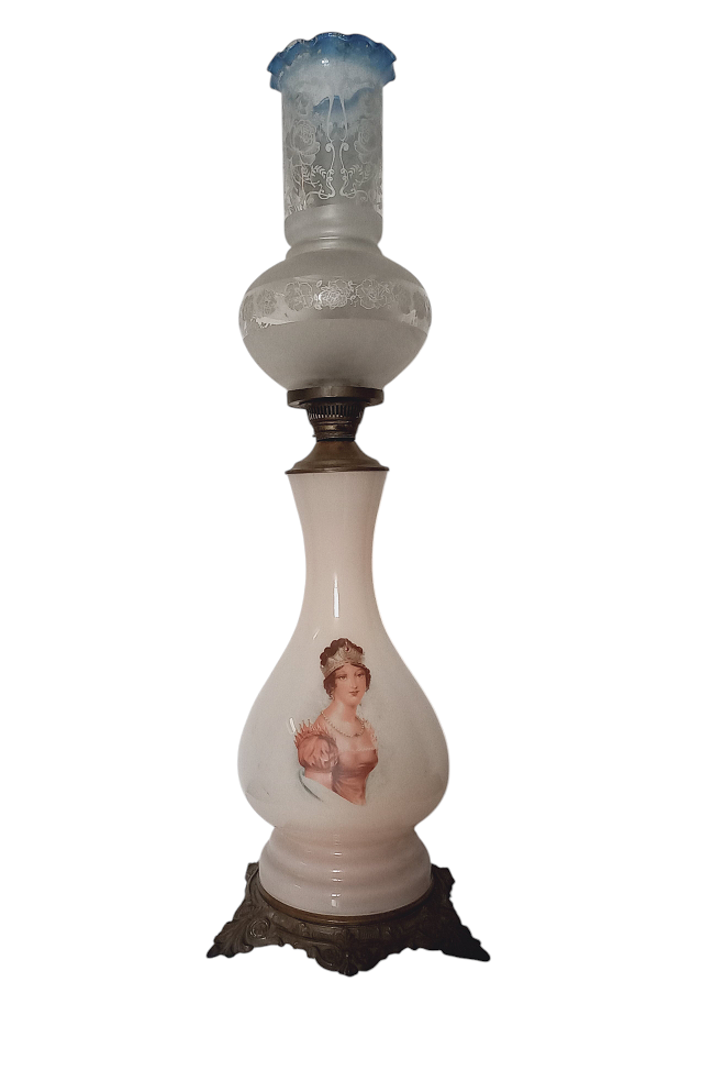 Lume a petrolio in vetro opalino color mandorla e metallo decorato con figura...