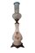 Lume a petrolio in vetro opalino color mandorla e metallo decorato con figura femminile h.cm.64
