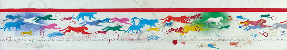 tecnica mista su carta applicata su tela riportata su tavola cm. 25x150x1,5; firma al centro sulla sinistra, opera registrata presso l'Archivio Alighiero Boetti (Roma) come da dichiarazione su foto.