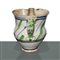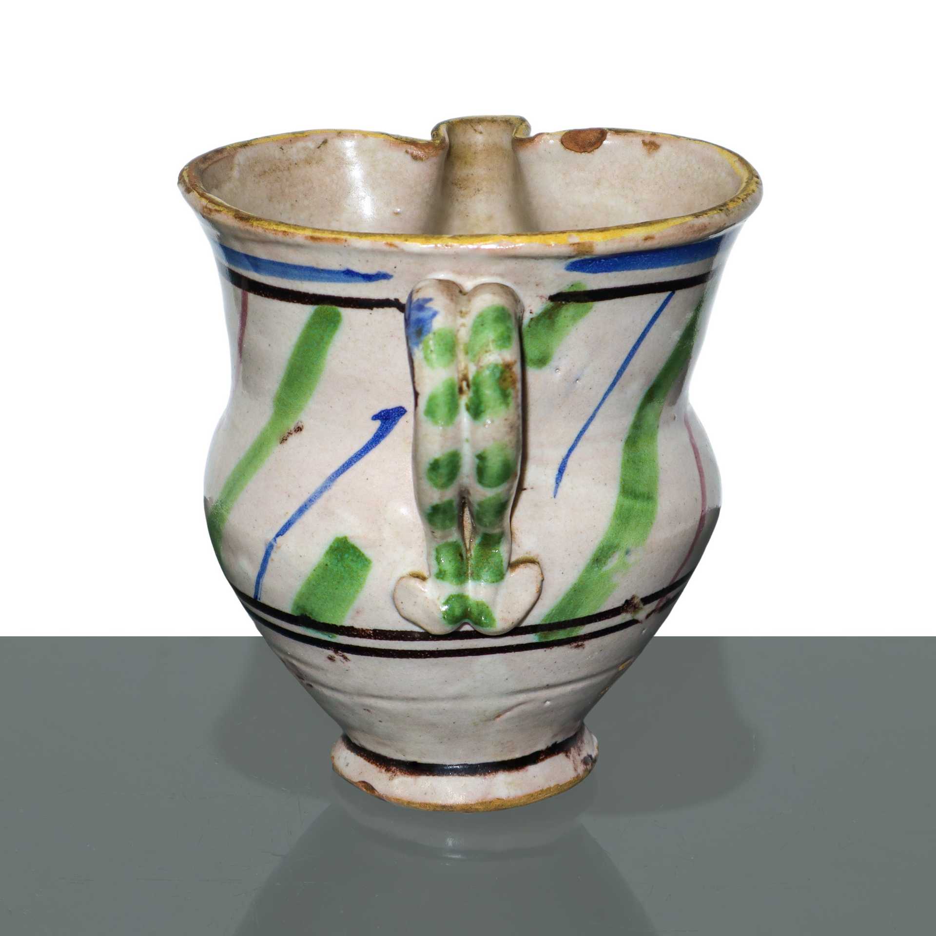Versatoio con manico in maiolica di Caltagirone invetriato smaltato e dipinto policromo, Primi 20° secolo h cm 15