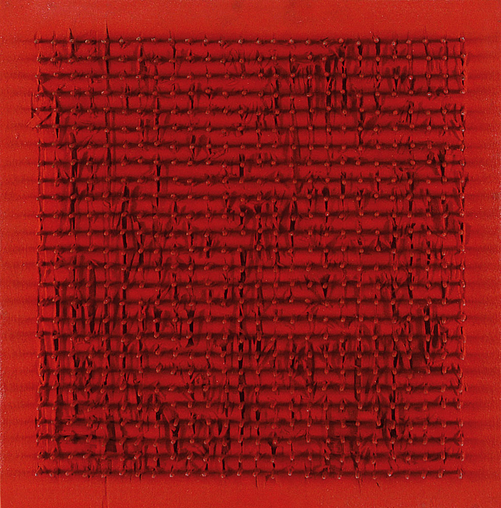 acrilici e chiodi su legno cm. 30x30, firma e anno al retro, dichiarazione d'autenticità dell'artista su foto.