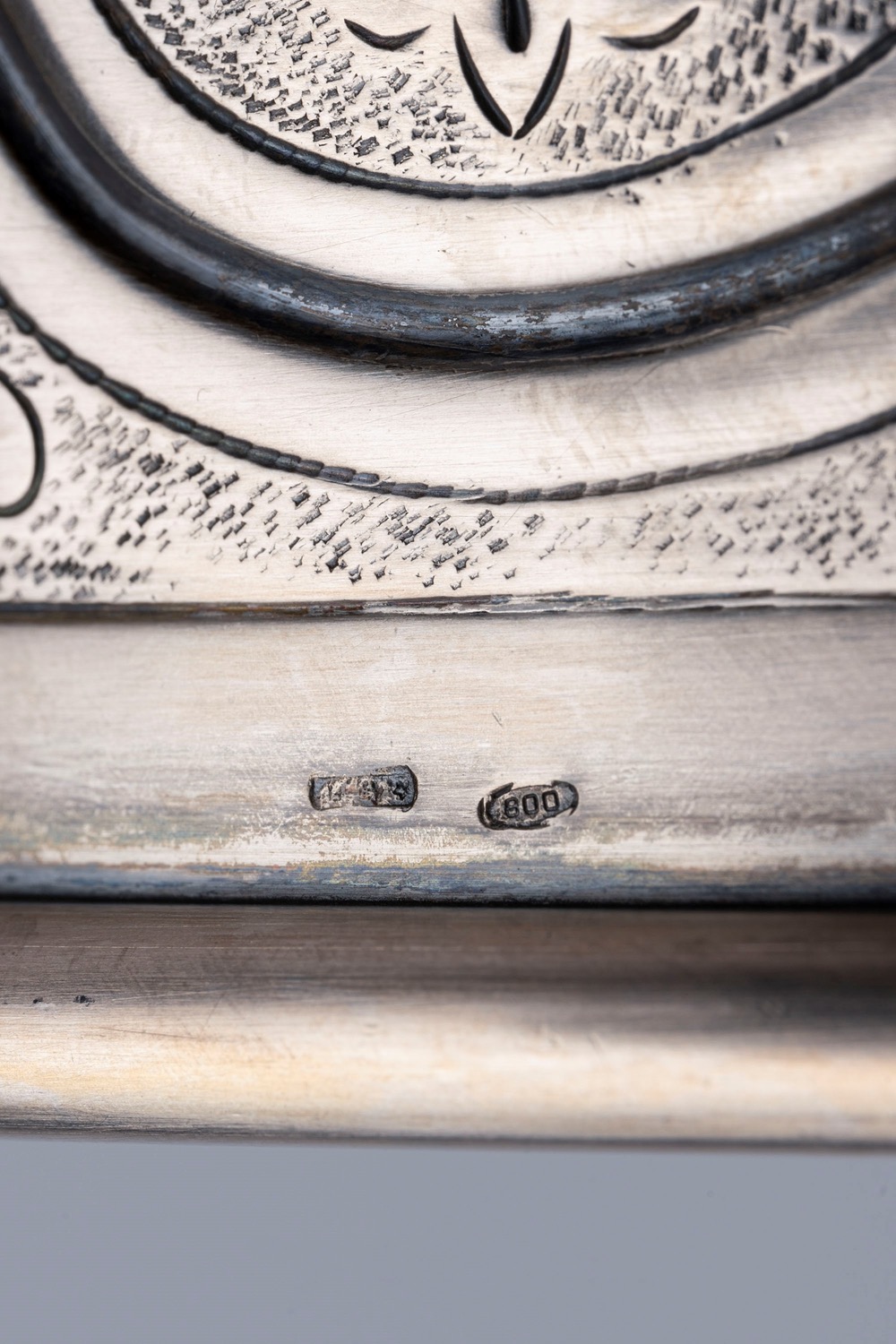 il corpo inciso e cesellato con motivi a volute e fogliacei, presa del coperchio con tre nani che sorreggono centrale in lapislazzuli.