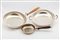 monogrammate AN; le padelle a profilo liscio (d cm 31,50 e 17,10) con manici in legno; il tegame con due manici (d cm 38,20), manici amovibili.