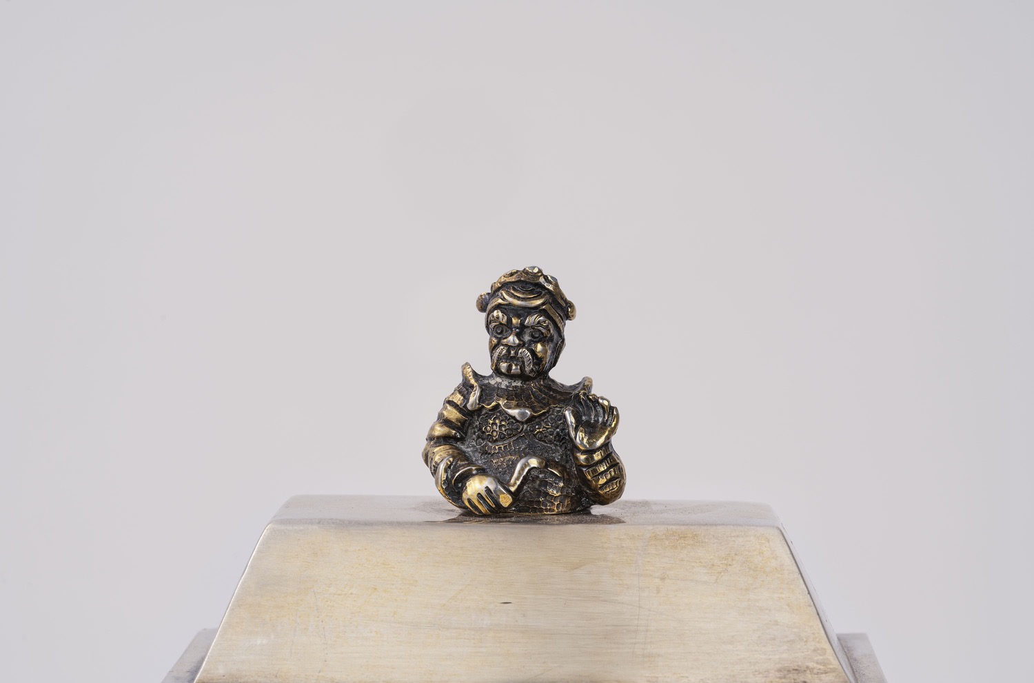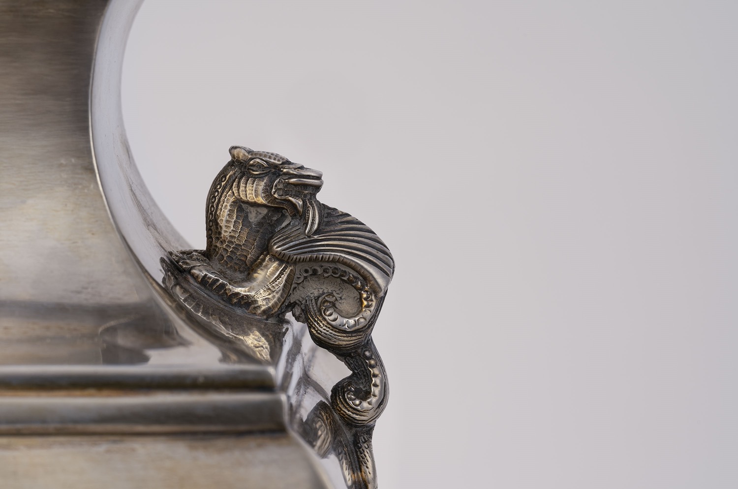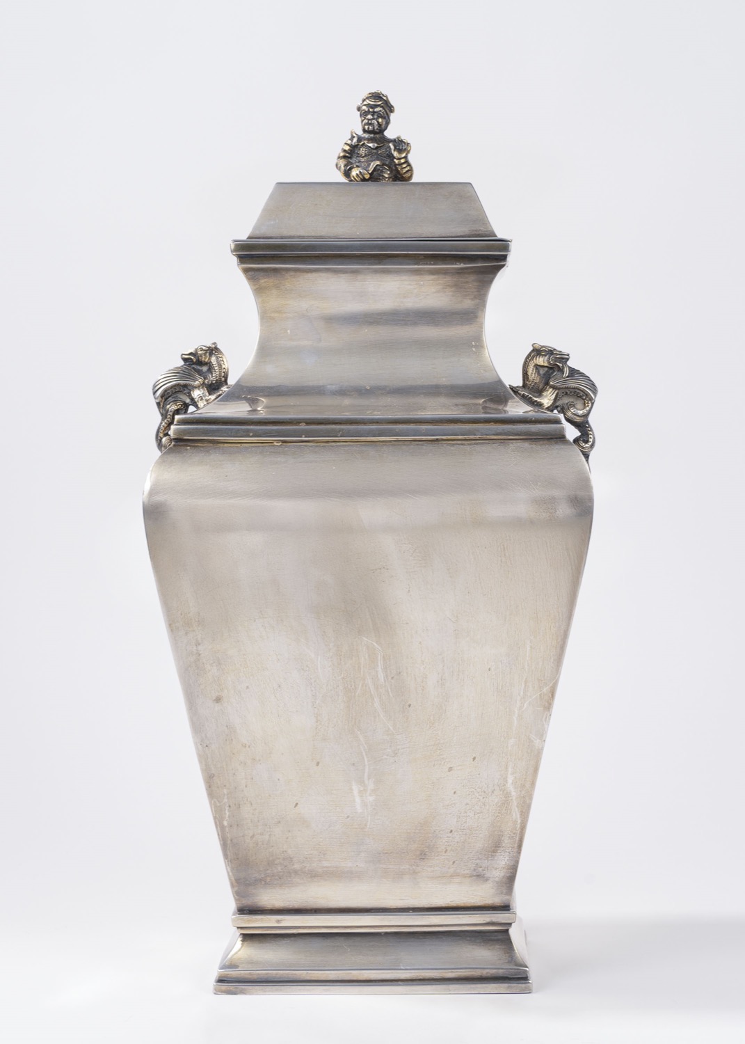 a corpo liscio, anse a foggia di belva mitologica, presa del coperchio con figura di Digitario.