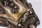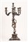 a sette fiamme, bracci mossi fogliacei, riccamente decorato e scolpito a decori fitomorfi, fusto con putto e viticci, base triangolare con mascherone, volute a conchiglie e foglie.