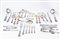 30 forchette, 18 coltelli, 16 forchettine, 18 coltelli piccoli, 18 cucchiai, 12 cucchiaini cocktail, 12 cucchiaini da caffè, 17 cucchiaini da dessert, 12 palette da gelato, 12 forchette da pesce, 12 forchettine da dessert, 12 coltelli da pesce, 15 serviti, 2 pinze e 7 serviti piccoli.