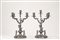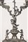 a cinque fiamme, base polilobata sorretta da quattro piedini ferini, cesellata e sbalzata con valve di conchiglia, fusto riccamente inciso e sbalzato a tronco d'albero con putti festanti a tutto tondo, bobeches a bocciolo.