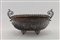 biansato con volute a ricciolo, si erge su quattro piedini fogliacei, decorato e sbalzato con frutta e festoni.
