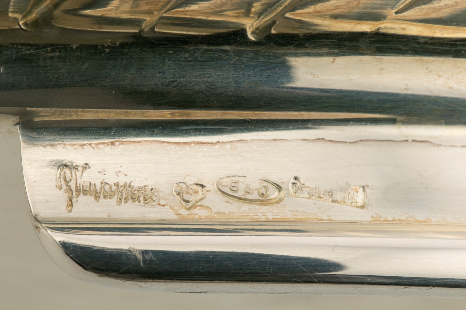 corpo liscio, decoro sbalzato, poggiante su quattro piedini sagomati.