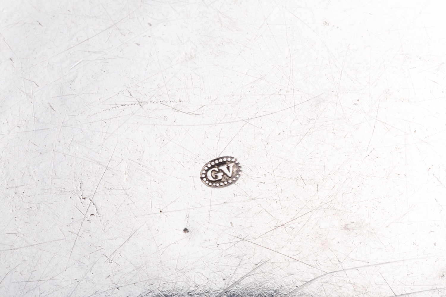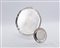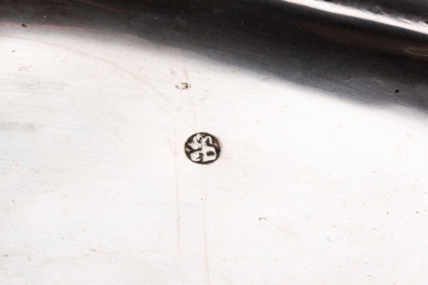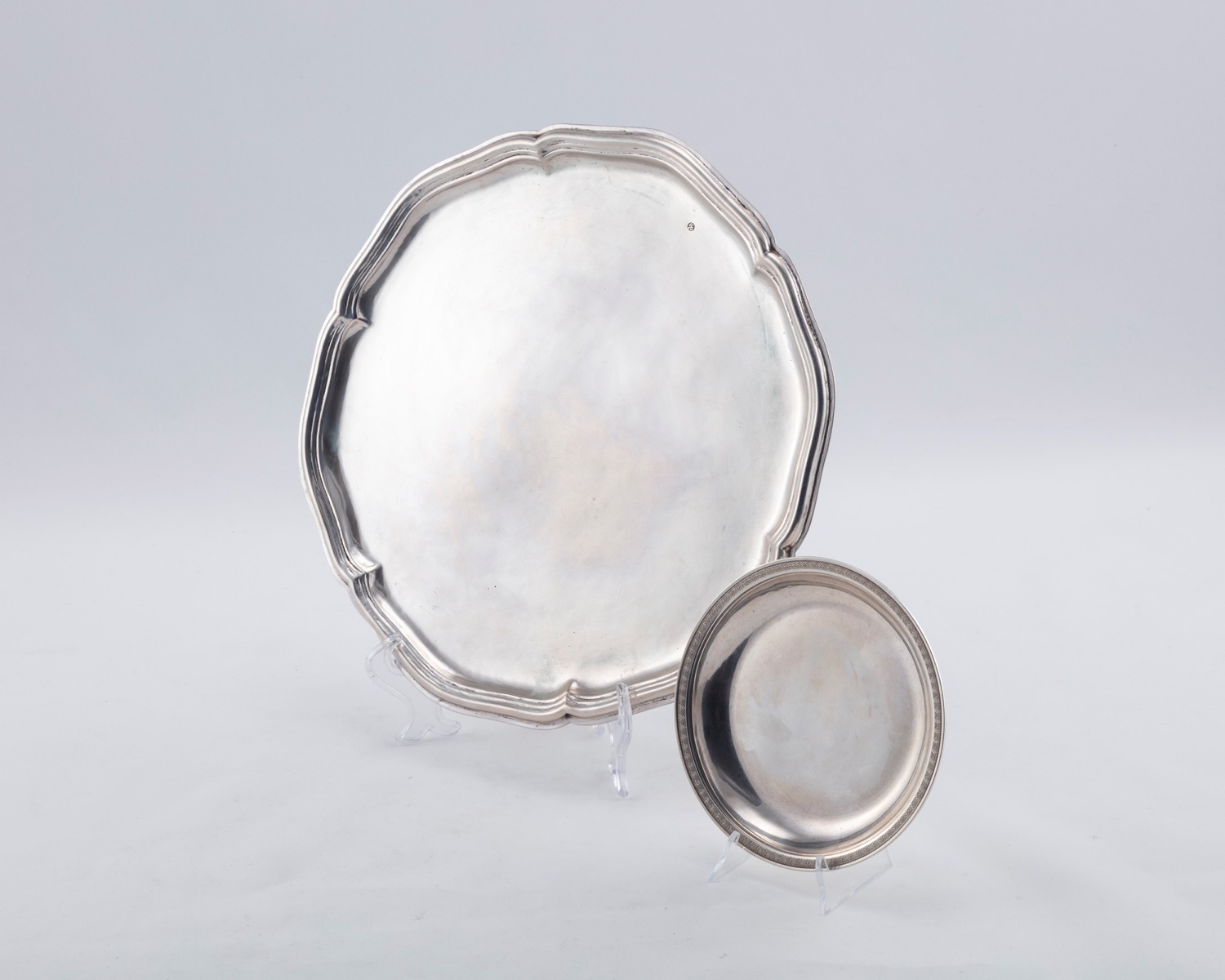 il piattino di forma circolare con bordo cesellato, reca punzone GV (Vernoni Giuseppe, Zecca di Torino 1779-1824)(d cm 13,20); il piatto da portata polilobato con bordo mistilineo, reca punzone raffigurante leone di San Marco (d cm 28,00).