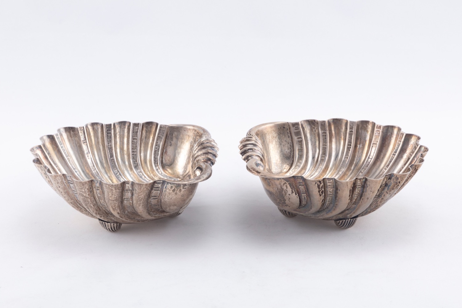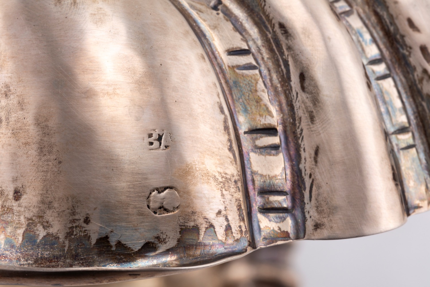 a foggia di valva di conchiglia, finemente sbalzate, poggianti su tre piedini a conchiglia.