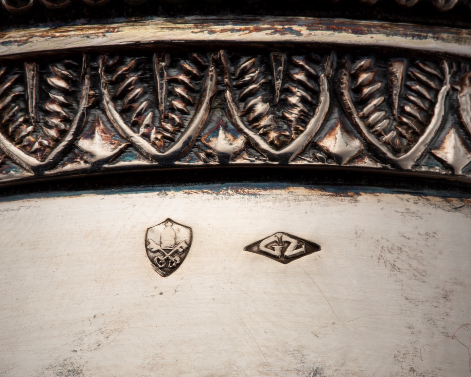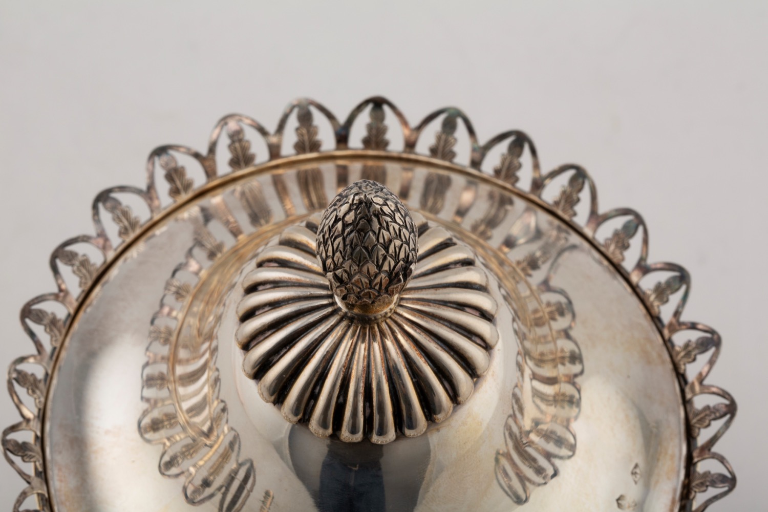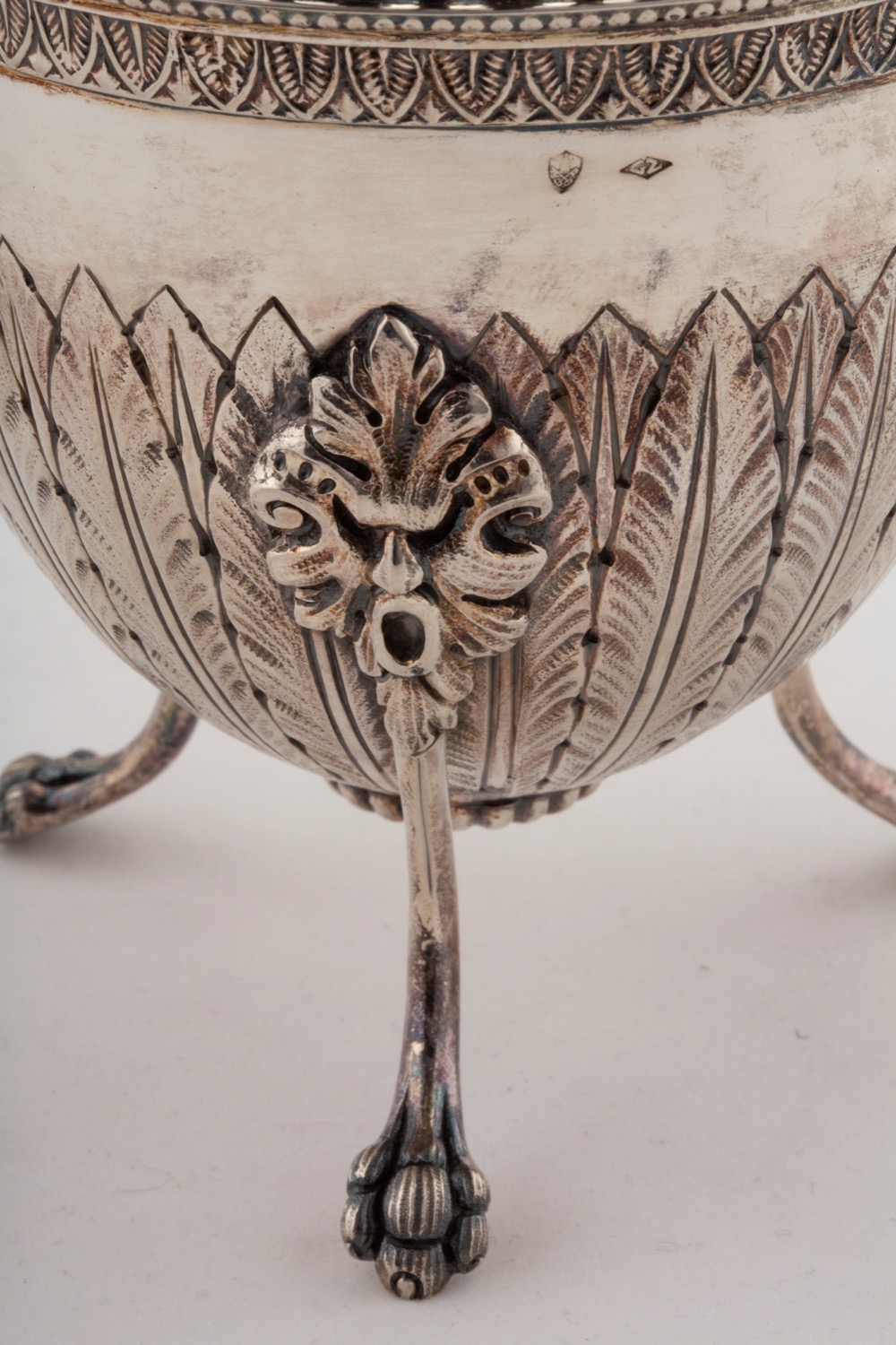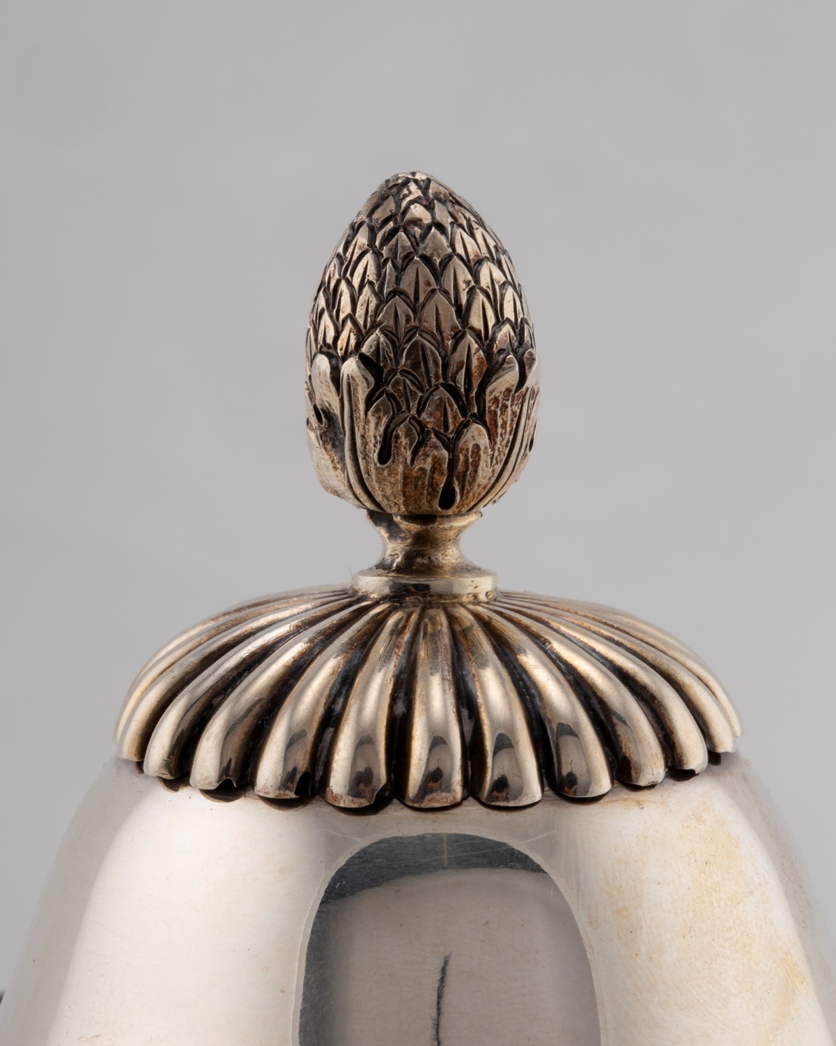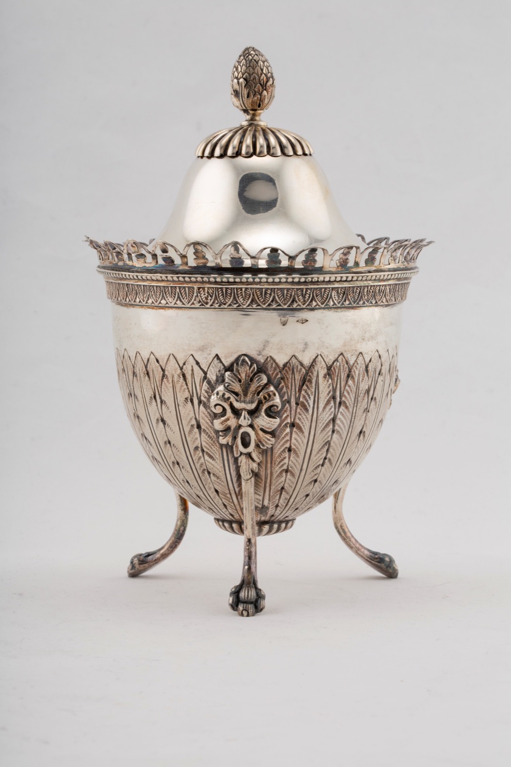 poggiante su tre piedini ferini terminanti in mascheroni, corpo decorato ad ampie volute e bordo a palmette, il coperchio con il bordo superiore reticolato con foglie, presa del coperchio scanalata sormontata da pigna.
