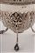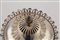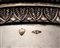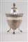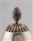 poggiante su tre piedini ferini terminanti in mascheroni, corpo decorato ad ampie volute e bordo a palmette, il coperchio con il bordo superiore reticolato con foglie, presa del coperchio scanalata sormontata da pigna.