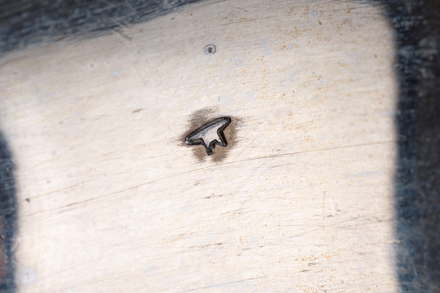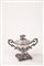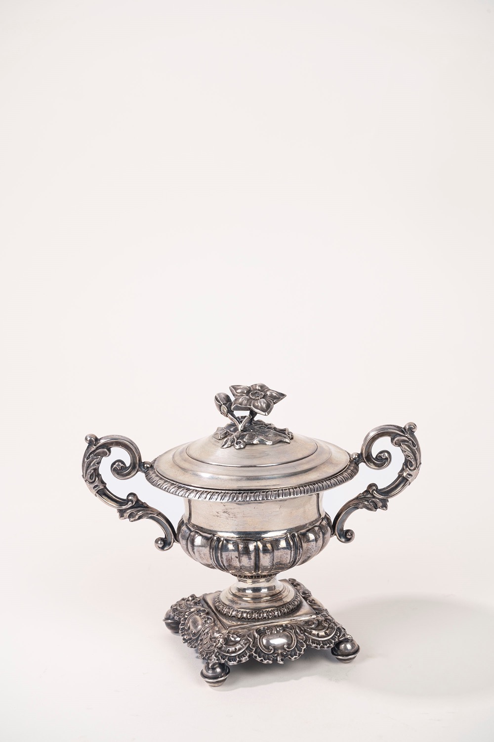 biansata a volute, base quadrata sbalzata su quattro piedini a boule, decori a rilievo, presa floreale.