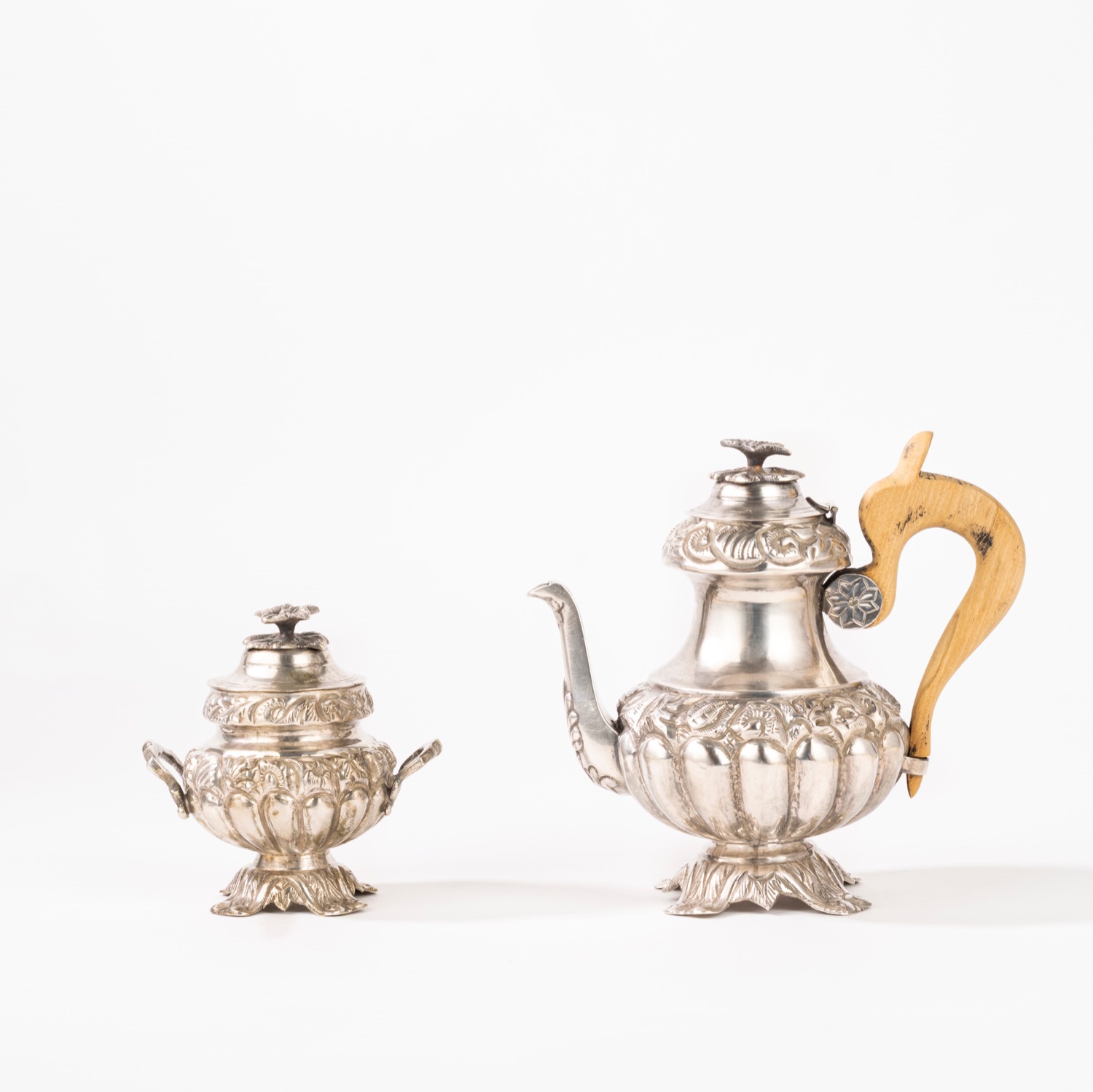 fuso e sbalzato, la teiera con manico in legno, entrambe decorate con motivi floreali e sormontate da presa a fiore.