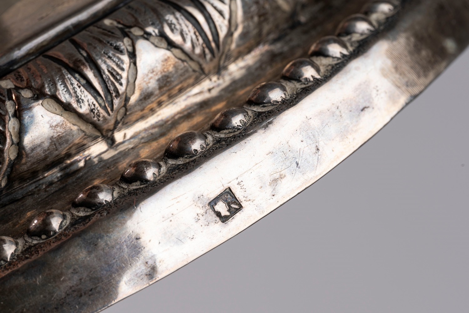 base circolare monogrammata, decoro a perline e fusto con incisioni fogliacee, difetti (ammaccature).