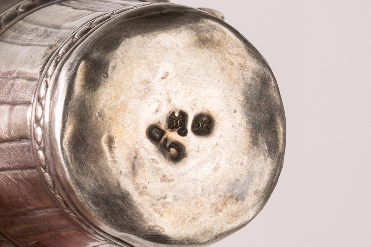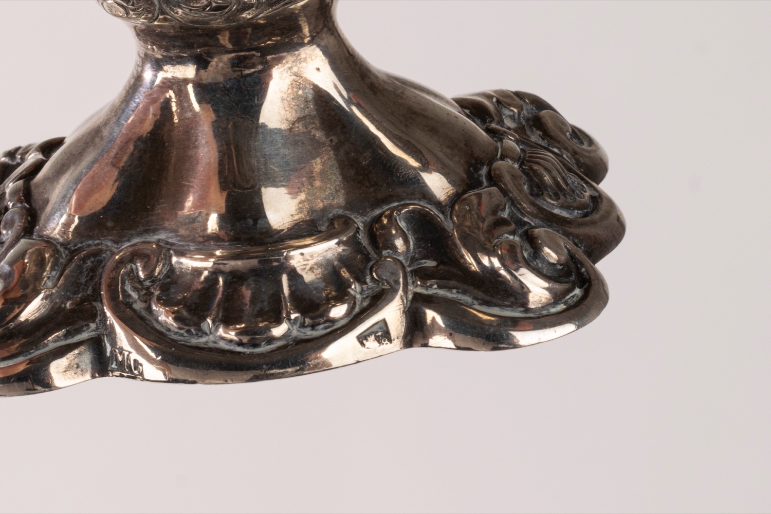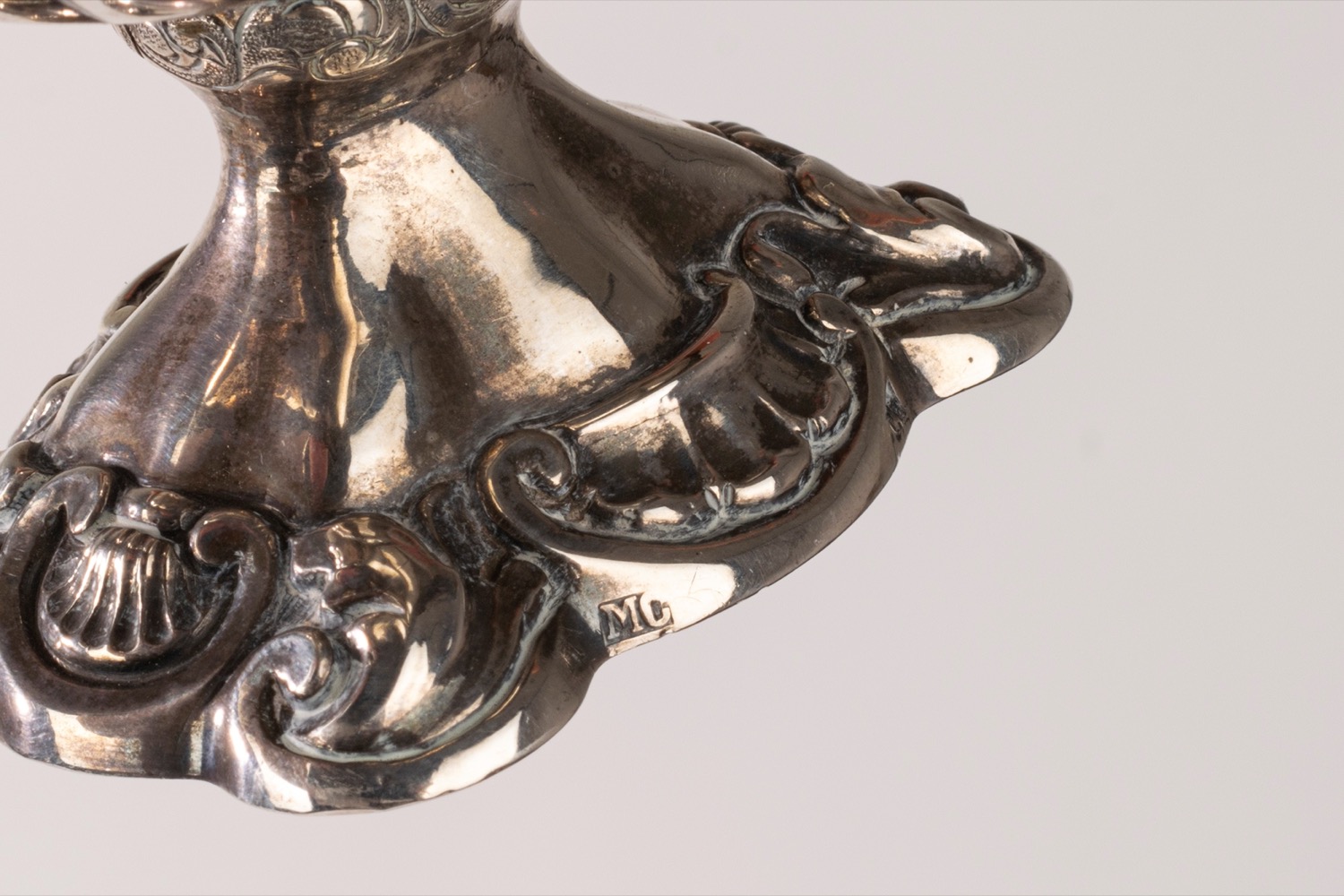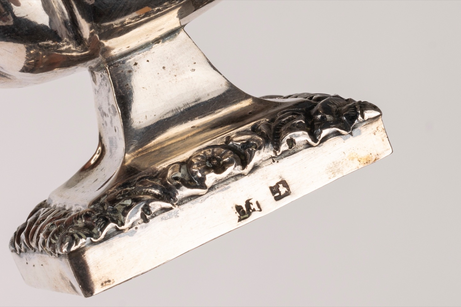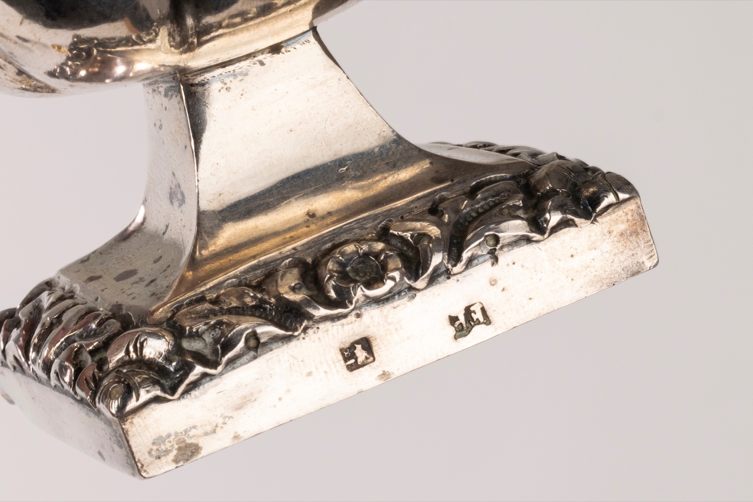 le saliere sbalzate a motivi floreali, tre con interno in vermeil, il cestino inciso.