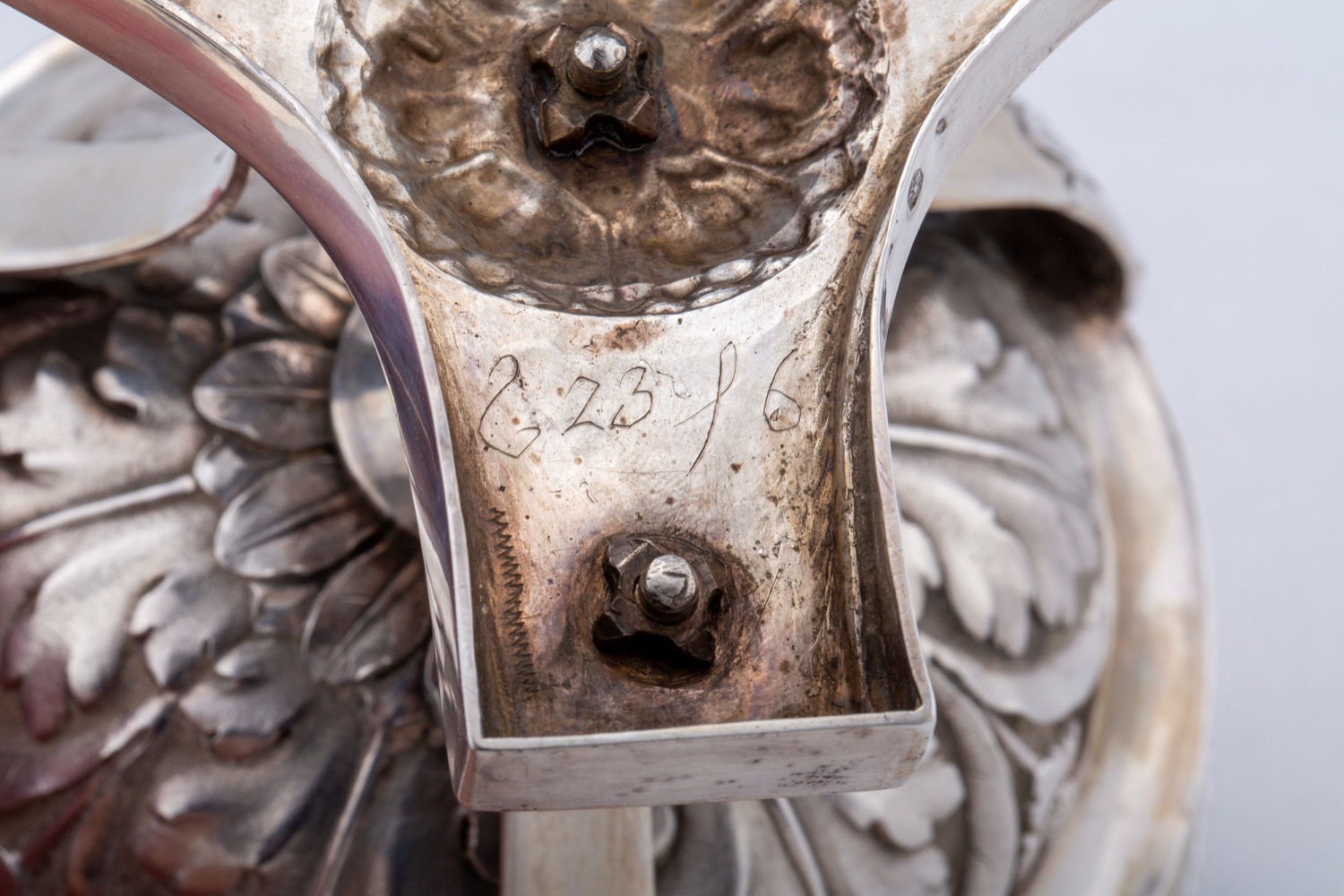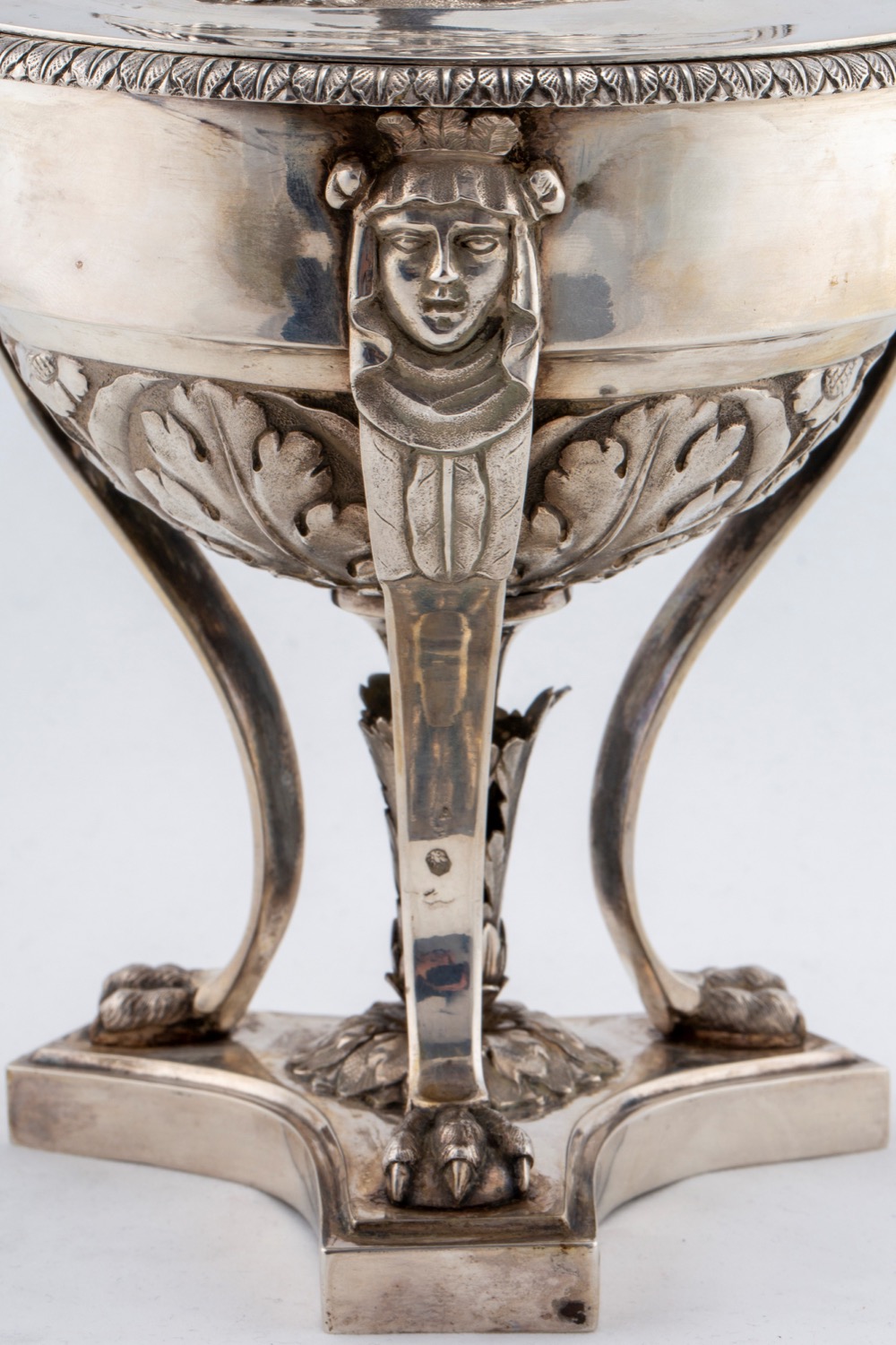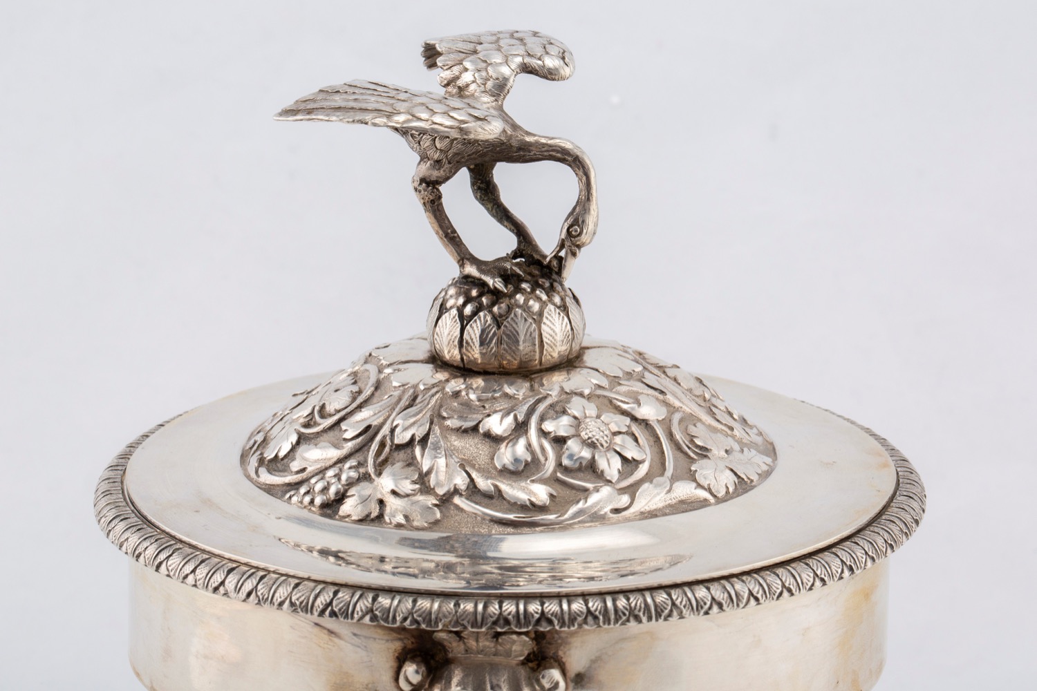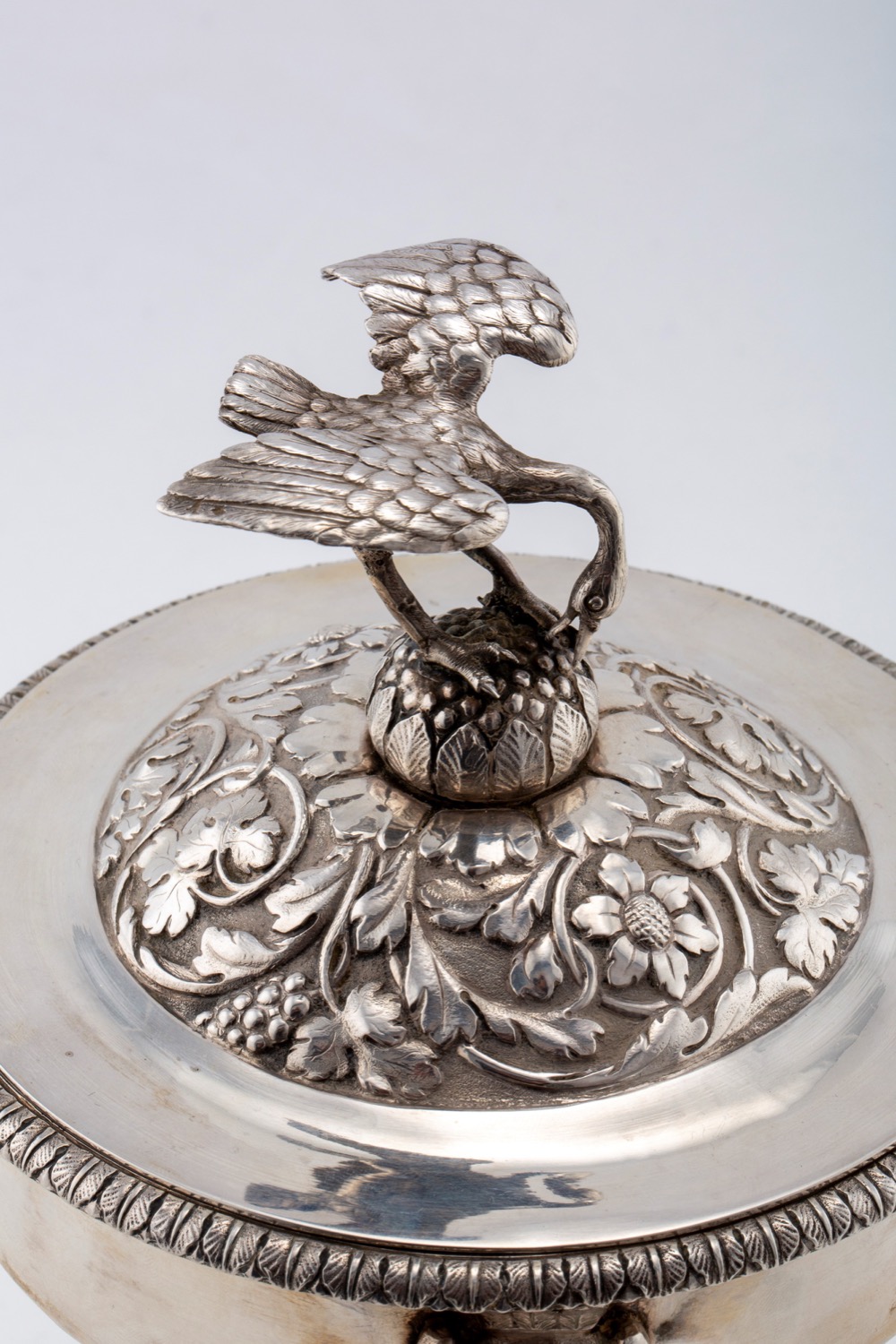 la zuccheriera argentiere GS (non identificato) Parma 1821-1872, con base tripode, piedini ferini terminanti in mascheroni, il corpo cesellato e sbalzato con decori floreali, il bordo inciso con foglie, il coperchio sbalzato con motivi fogliacei e presa del coperchio con fenicottero (h cm 22,50);