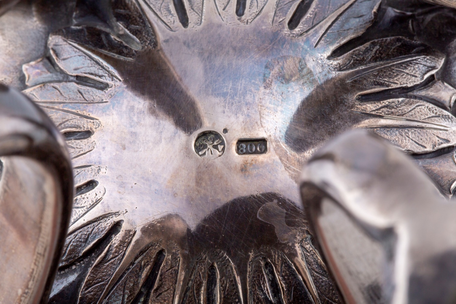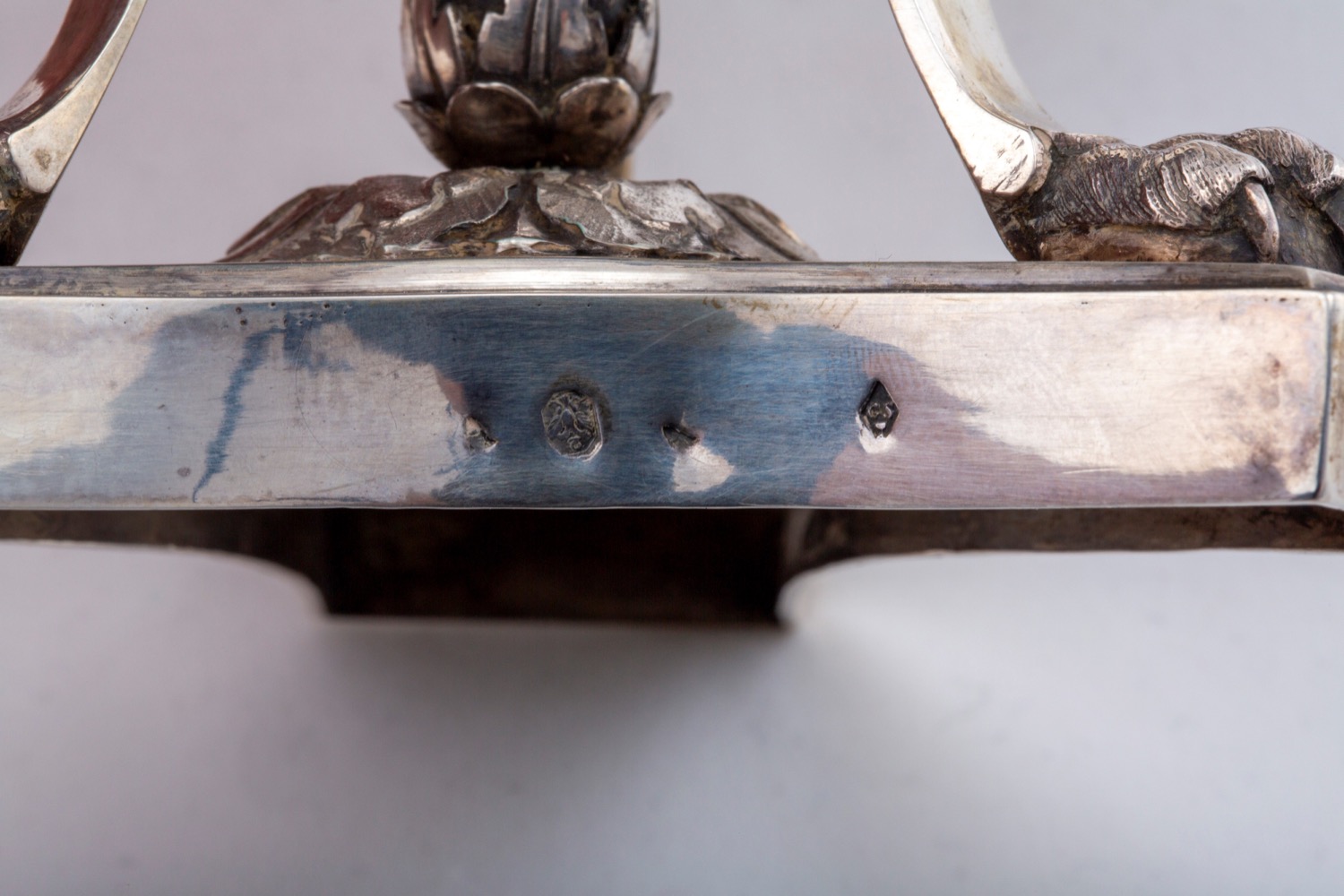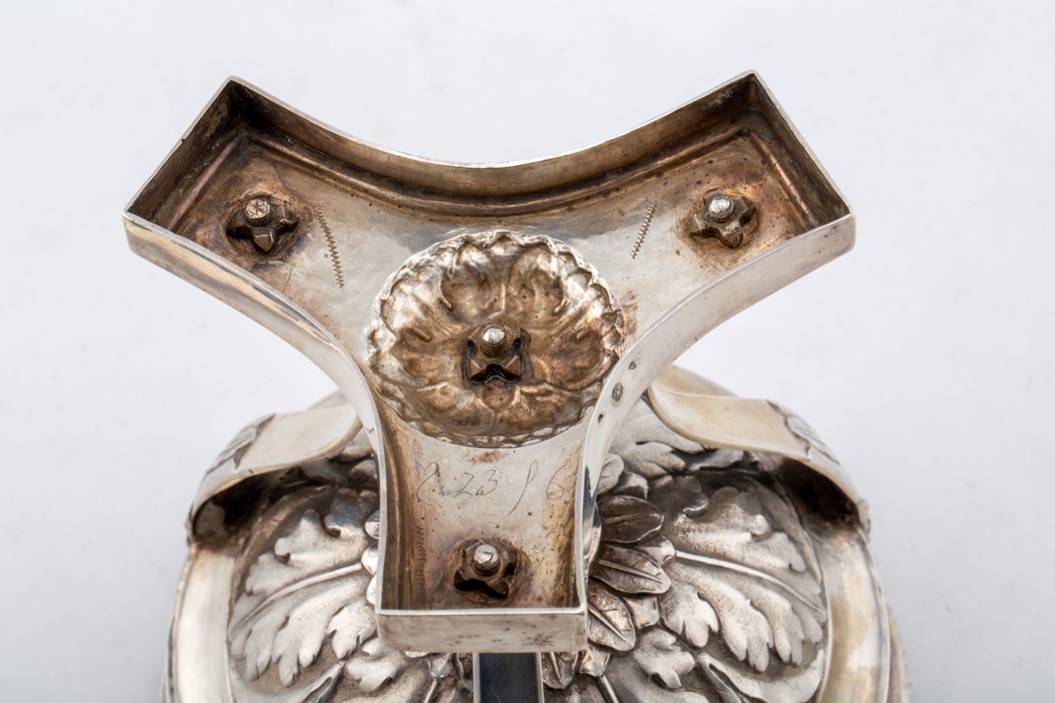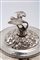 la zuccheriera argentiere GS (non identificato) Parma 1821-1872, con base tripode, piedini ferini terminanti in mascheroni, il corpo cesellato e sbalzato con decori floreali, il bordo inciso con foglie, il coperchio sbalzato con motivi fogliacei e presa del coperchio con fenicottero (h cm 22,50);