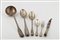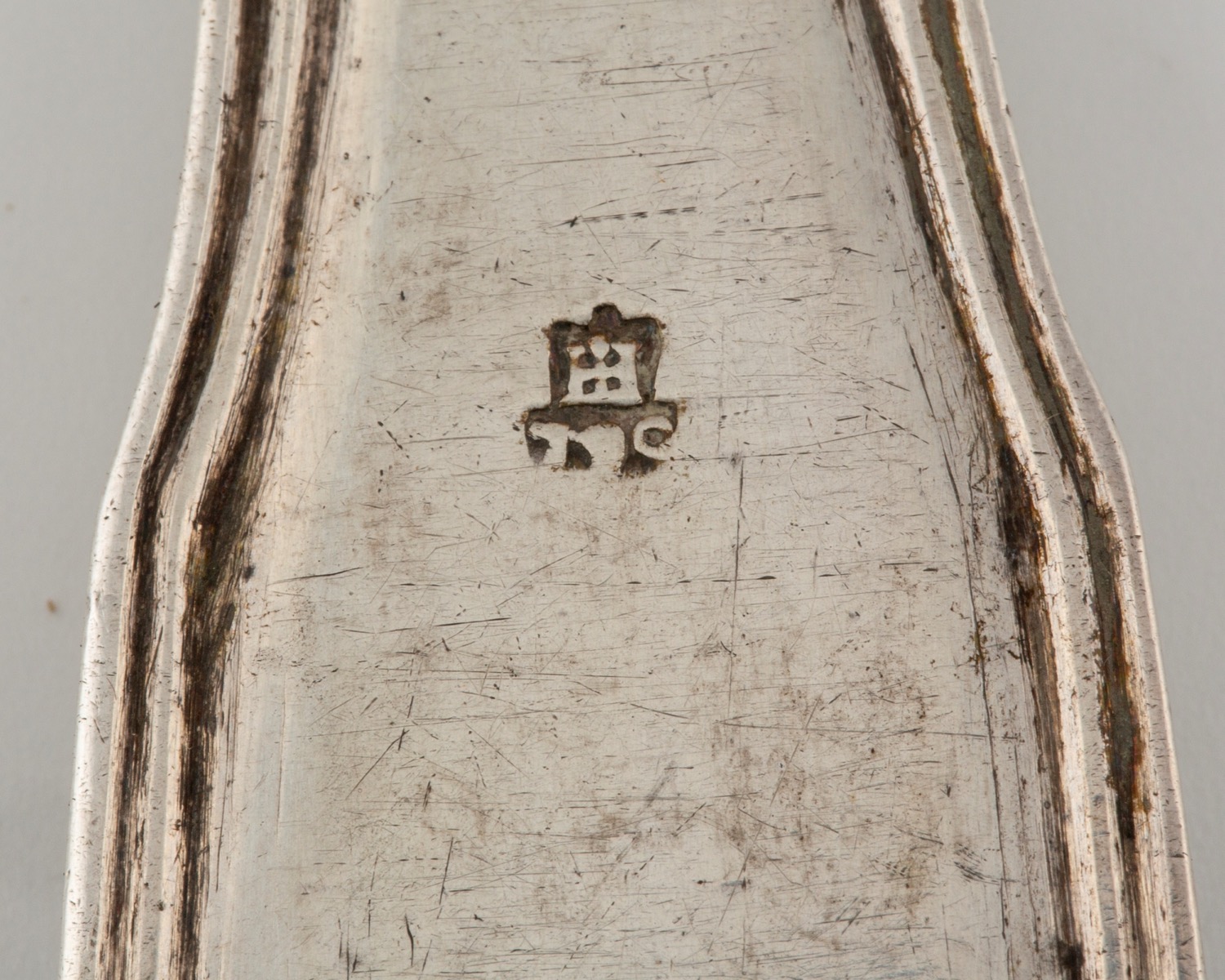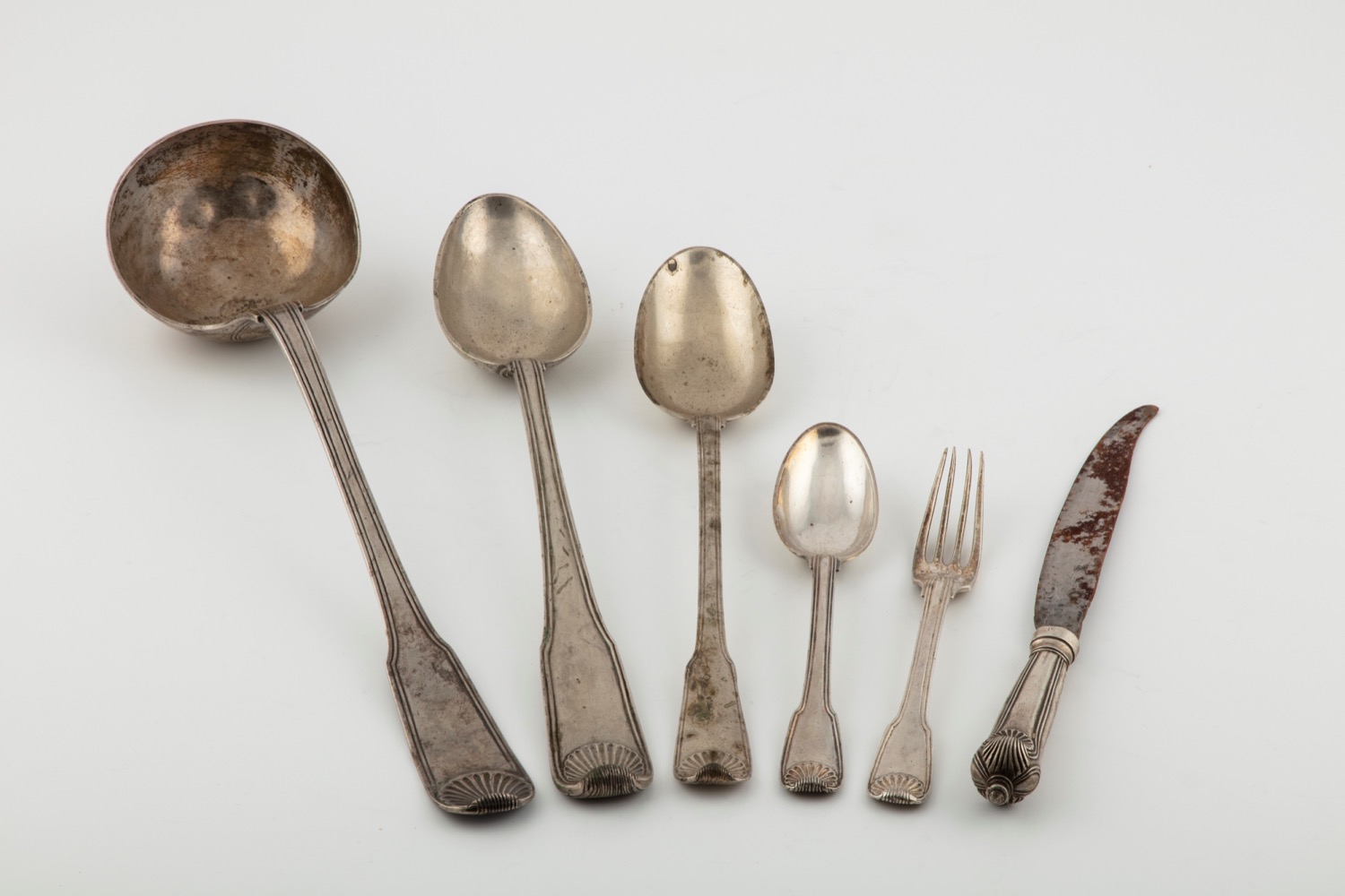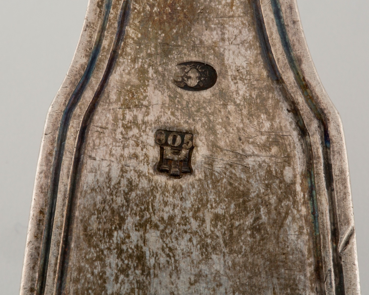 26 cucchiai grandi, punzonati Torretta, 26 forchette grandi, punzonate Torretta, 24 coltelli grandi, punzonati Torretta, 2 serviti, punzonati Torretta; 1 mestolo grande dell'argentiere ET, punzonato Torretta per l'anno 1805, 6 cucchiai grandi, argentiere ET e 2 privi di punzonatura, 7 forchette, Argentiere ET, (difetti).