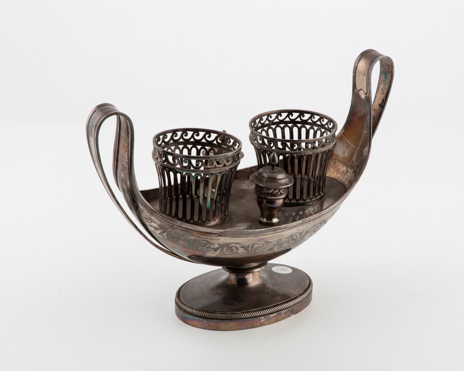 base ovale cordonata, corpo con fascia incisa a motivi fogliacei, difetti (ampolle mancanti).