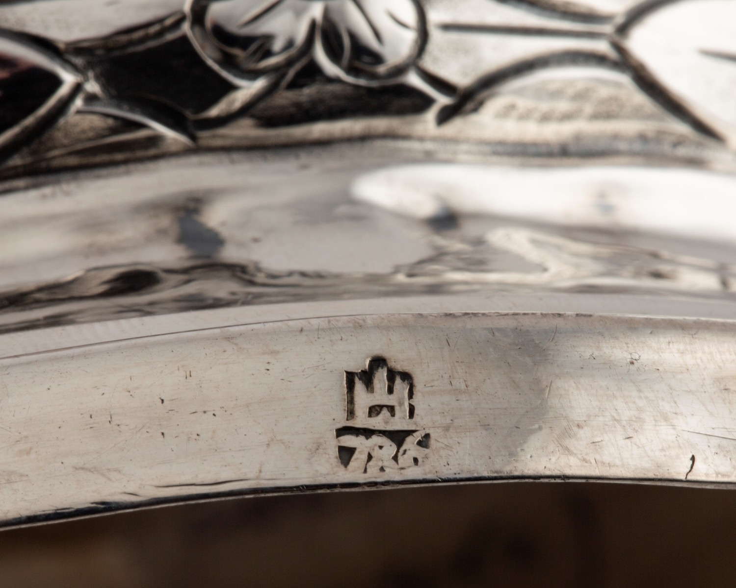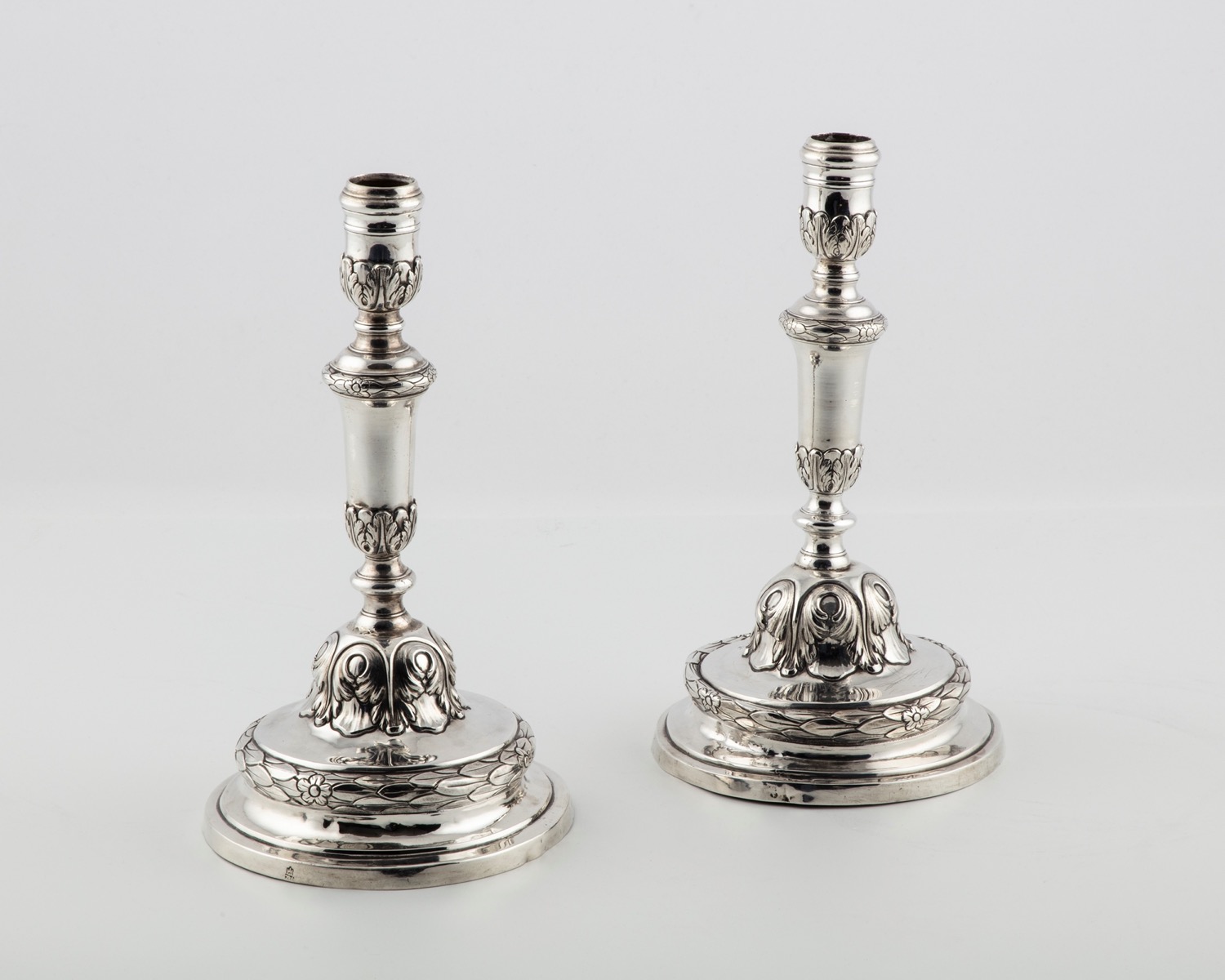 fusi e finemente sbalzati, base circolare con fascia decorata a decori floreali, fusto a balaustro con decorazioni fogliacee a rilievo.