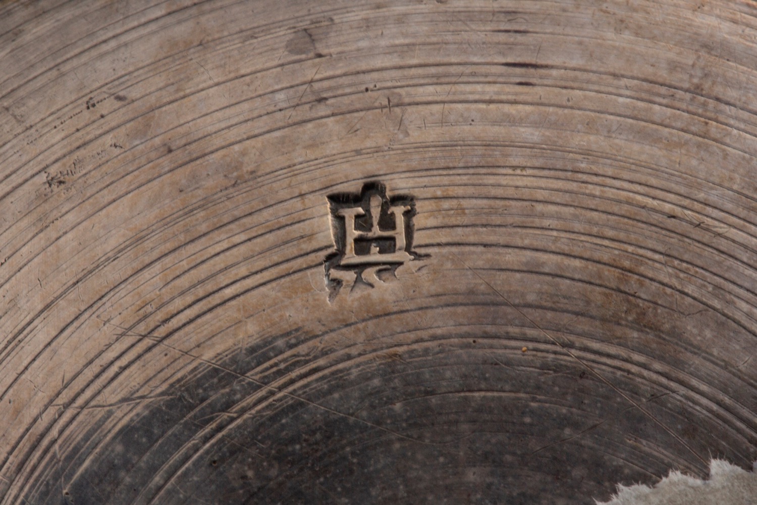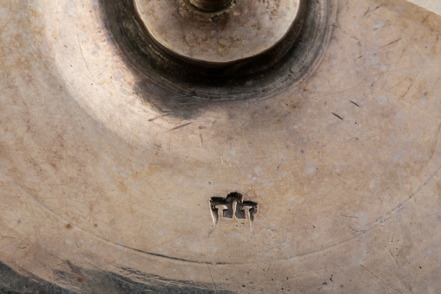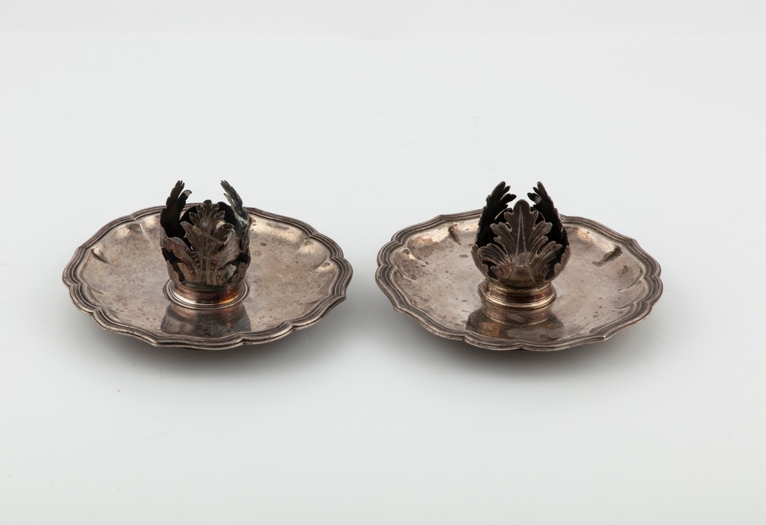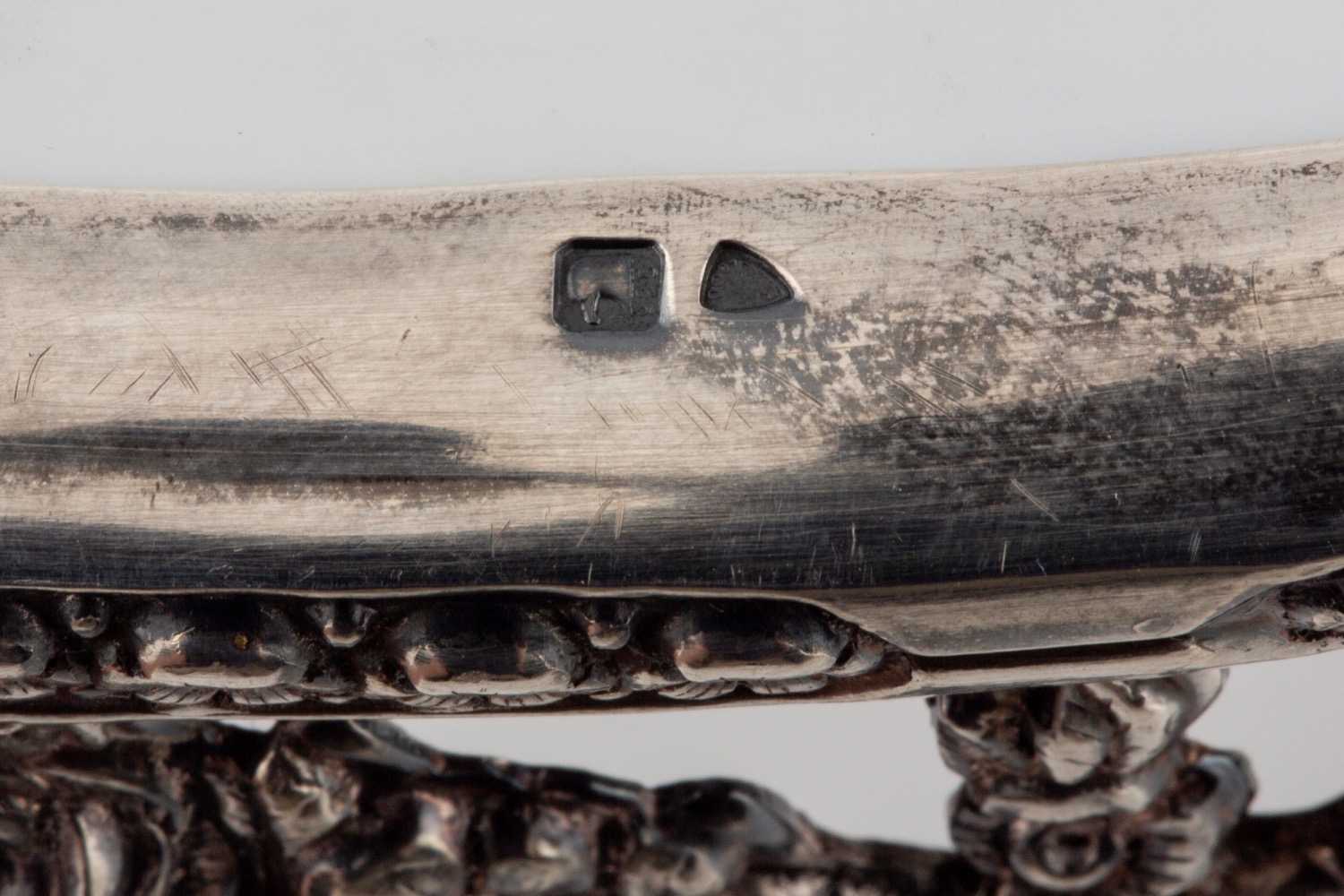 con piatto a bordo mistilineo, porta tazzine sbalzati a foggia di foglie sagomate e nervate.