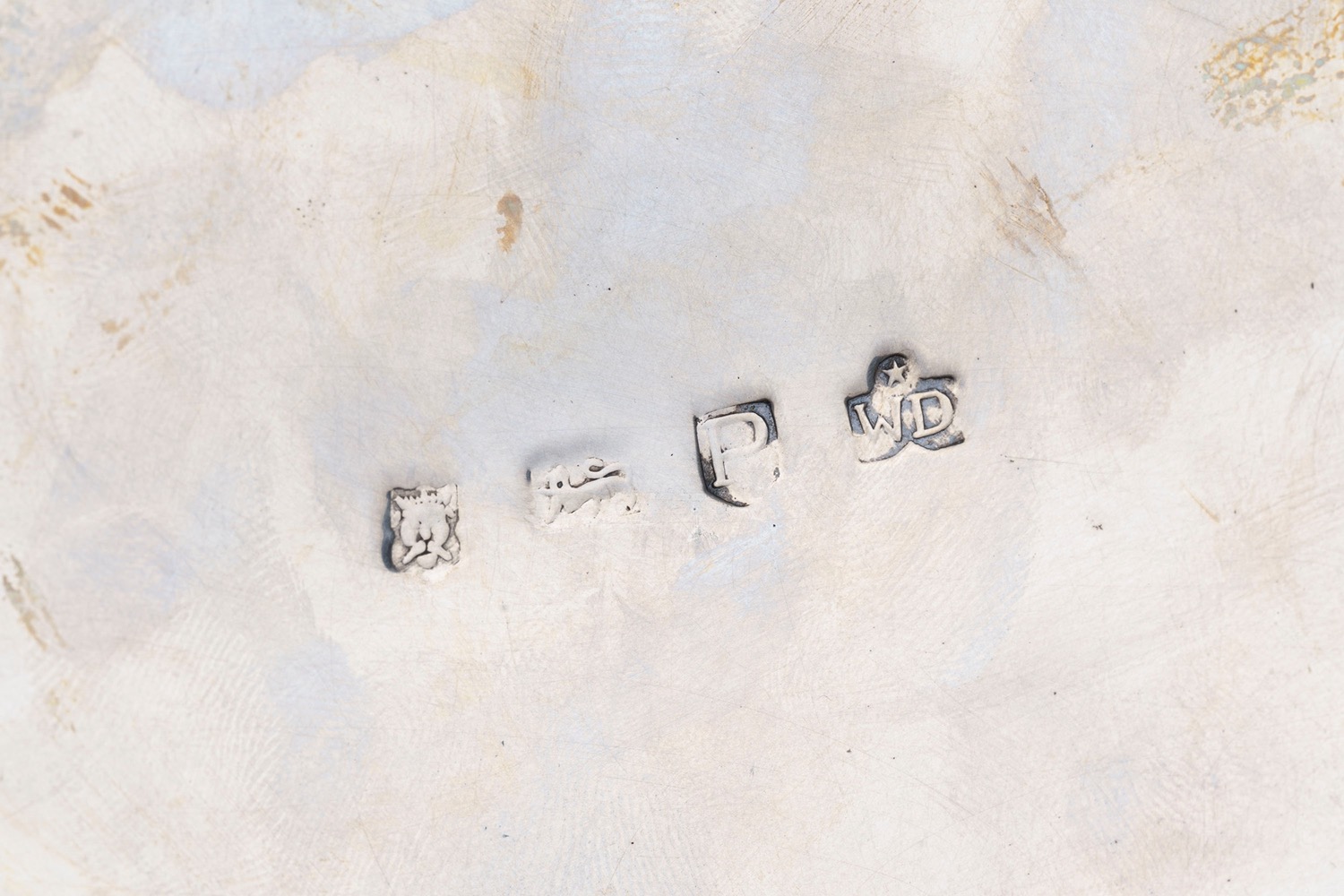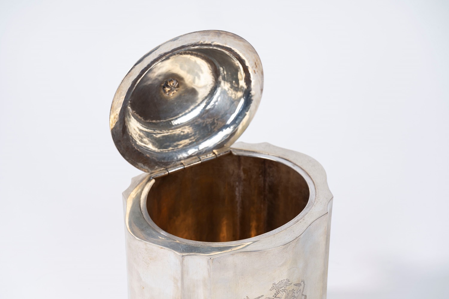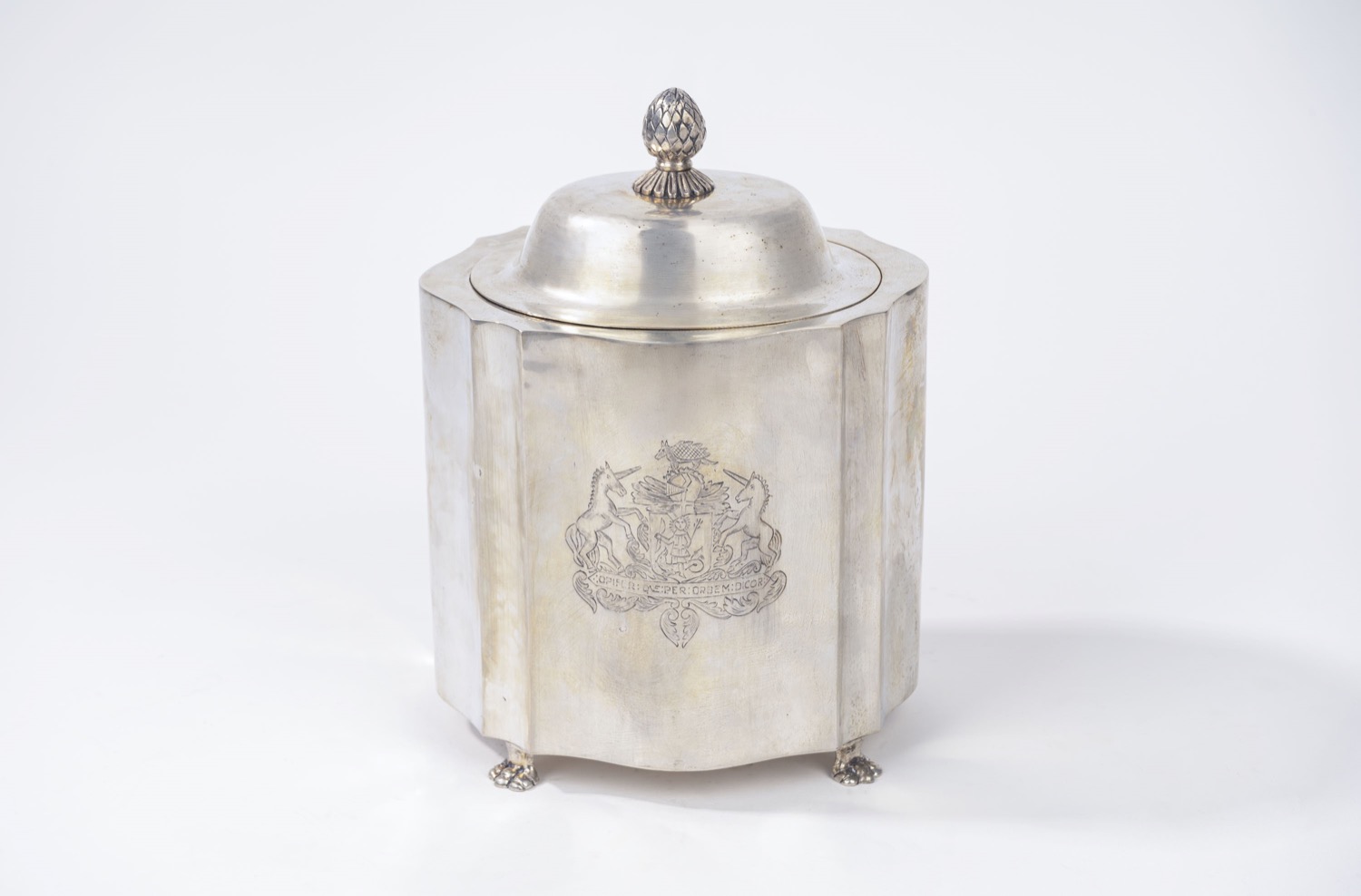 di forma polilobata, poggiante su quattro piedini ferini, presa del coperchio a pigna; sul copro stemma nobiliare inciso con motto "opiferque per orbem dicor".