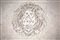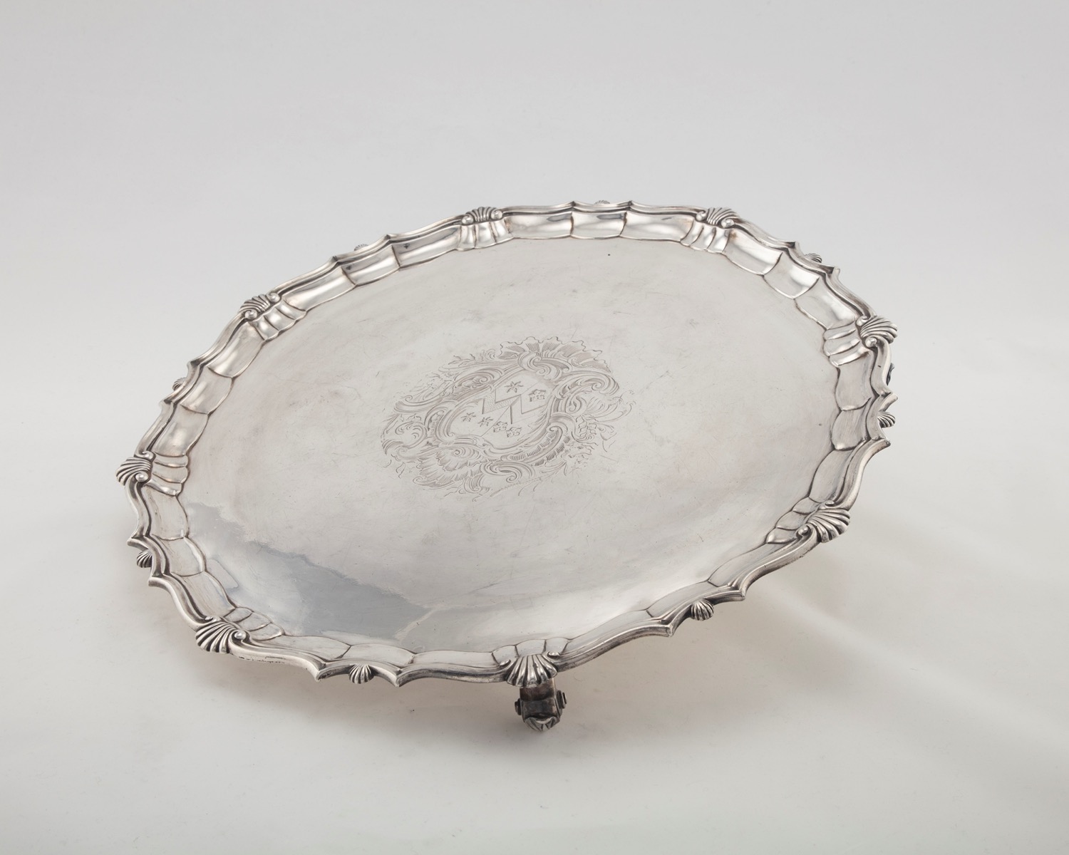 centrato da stemma araldico inciso, bordo mistilineo intervallato da conchiglie, sorretto da quattro piedini a ricciolo.