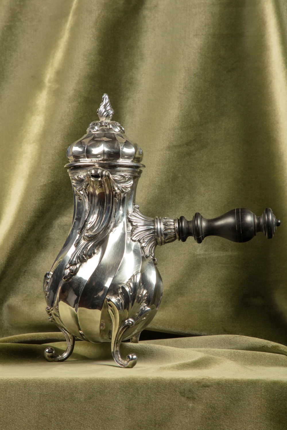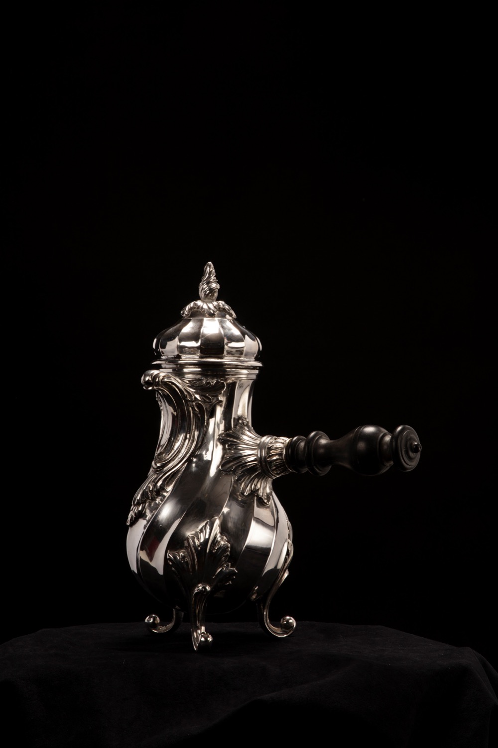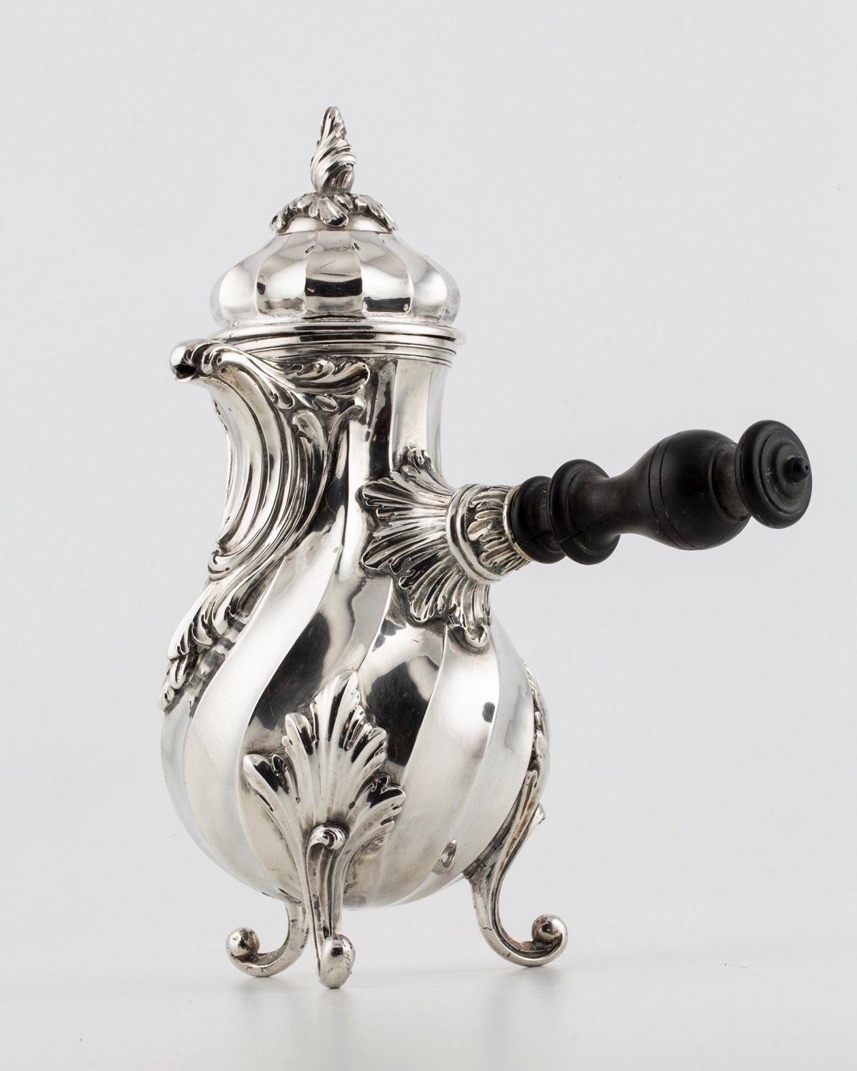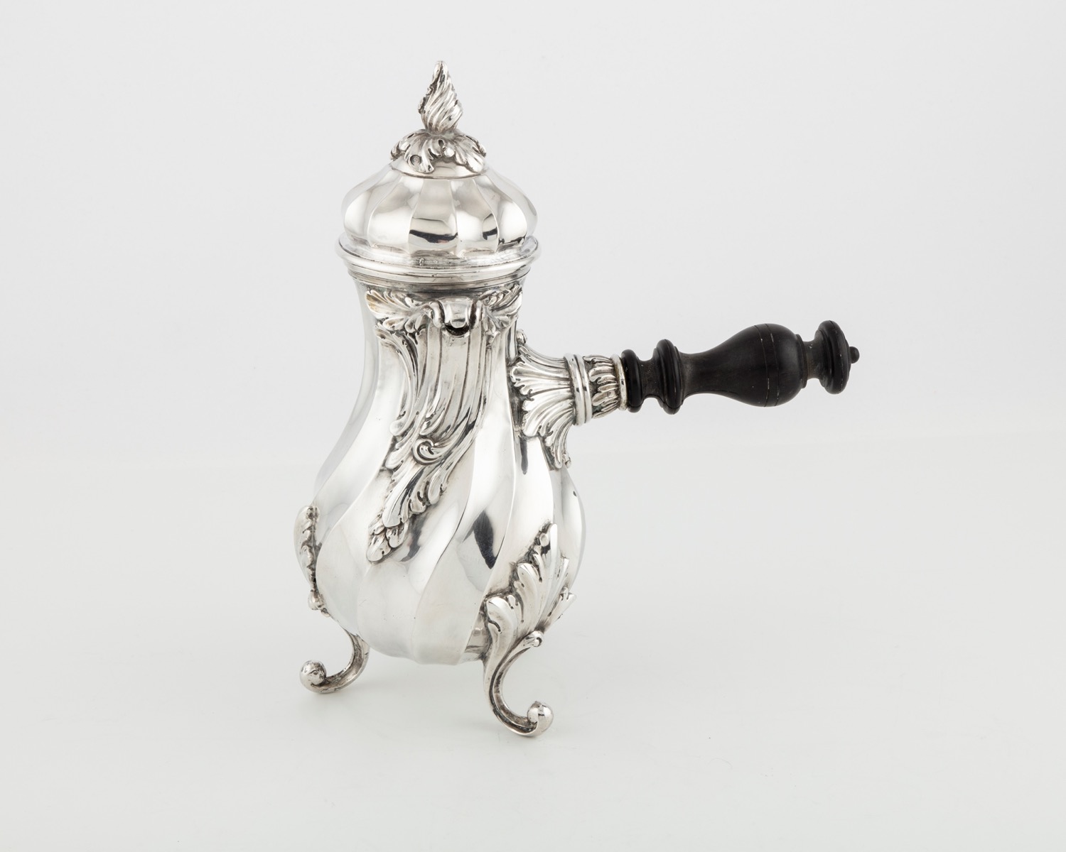 fuso e cesellato, corpo piriforme con andamento tortile, poggiante su tre piedi a volute fitomorfi, presa del coperchio fogliaceo (manico in ebano tornito).