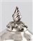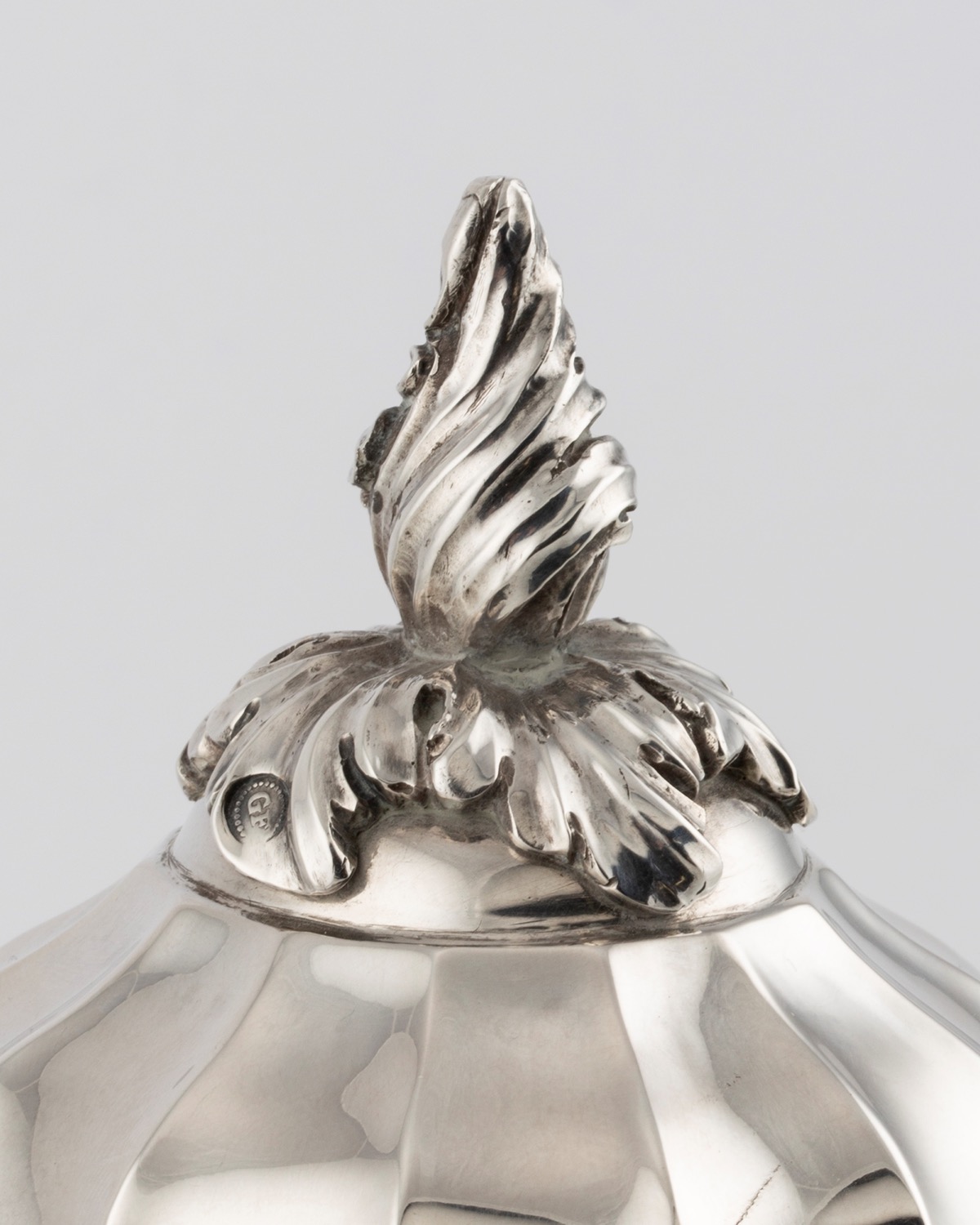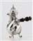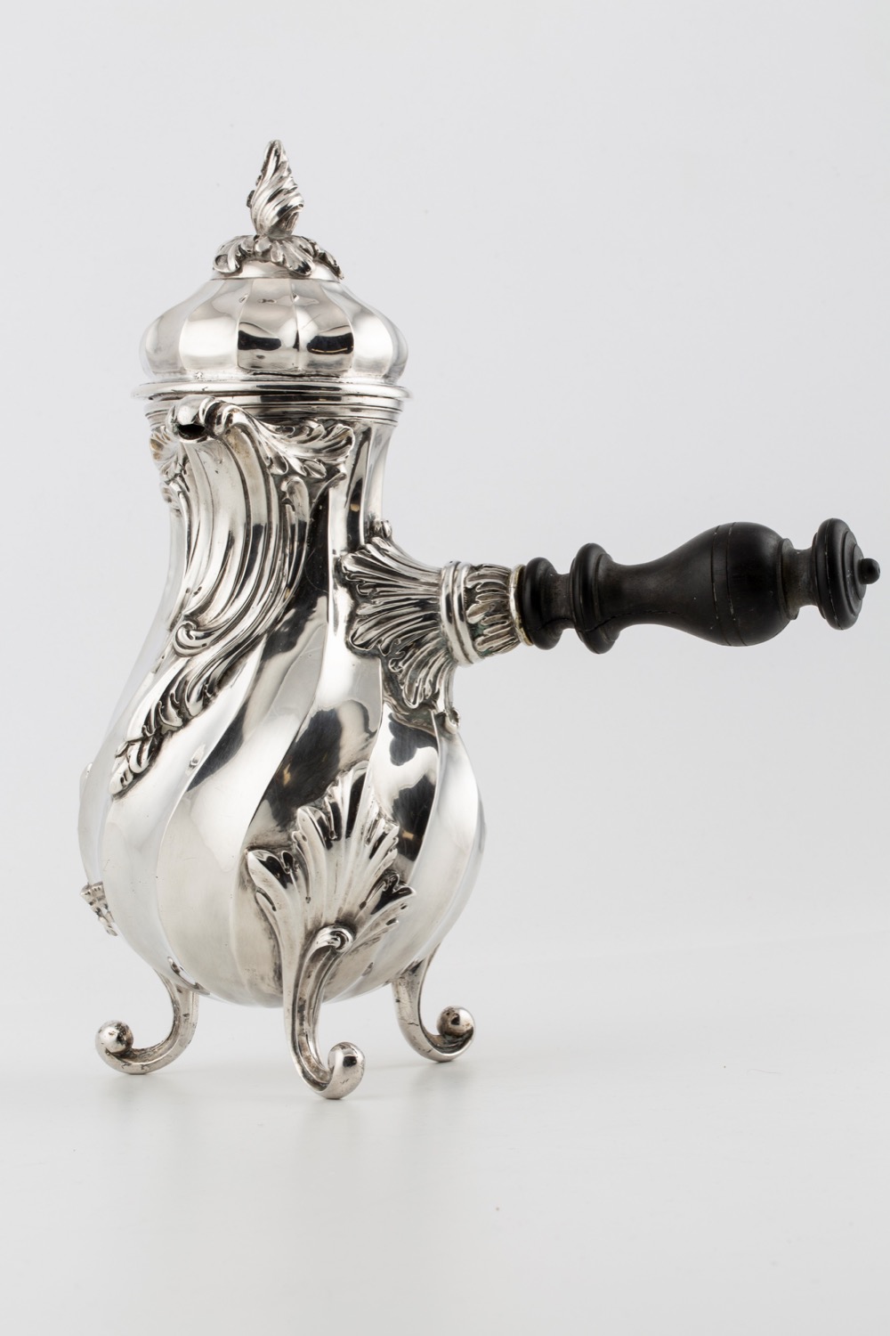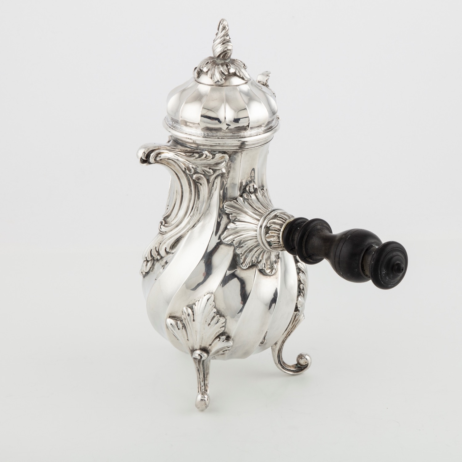 fuso e cesellato, corpo piriforme con andamento tortile, poggiante su tre piedi a volute fitomorfi, presa del coperchio fogliaceo (manico in ebano tornito).