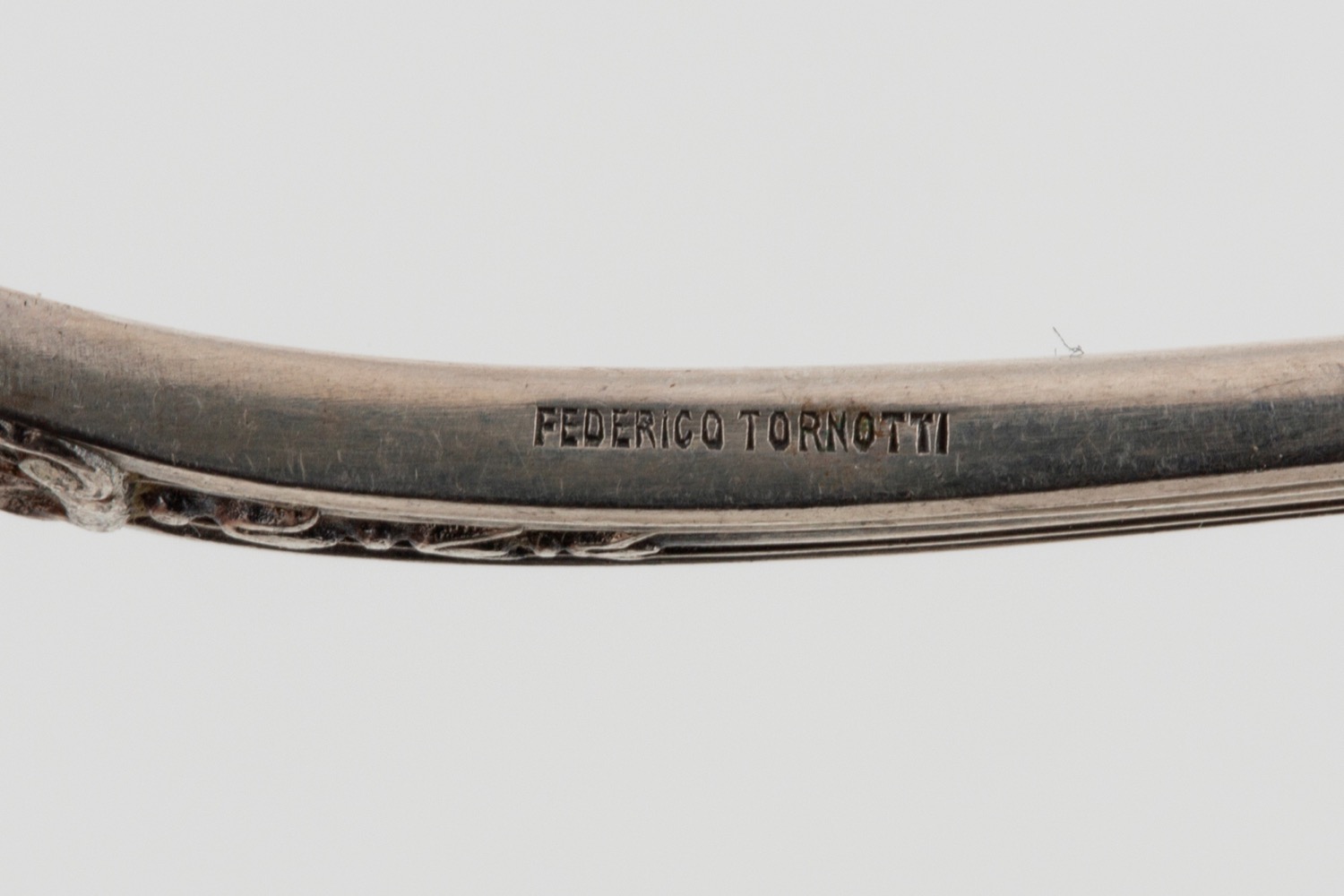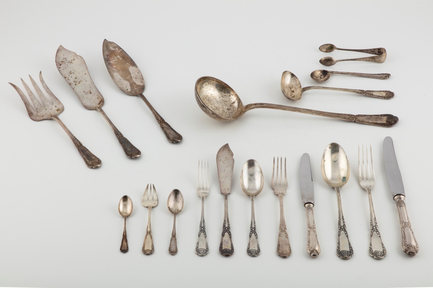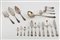 11 coltelli da pesce, 17 cucchiai grandi, 17 cucchiai medi, 24 forchette grandi, 8 forchettine da dolce, 6 coltelli da frutta, 11 coltelli grandi, 9 forchette da pesce, 21 forchette da frutta, 9 cucchiaini da caffè, 3 cucchiaini, 5 serviti, accompagnato da un cucchiaio dello stesso decoro dell'argentiere francese Emile Puiforcat, una forchettina e un cucchiaino Ricci e un coltello.