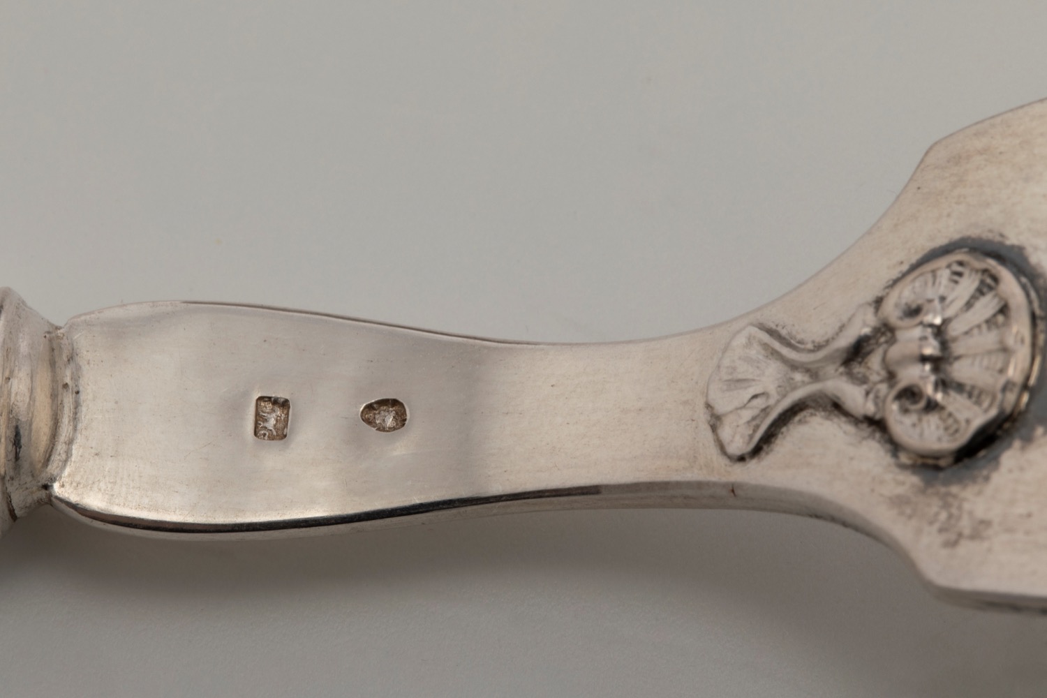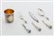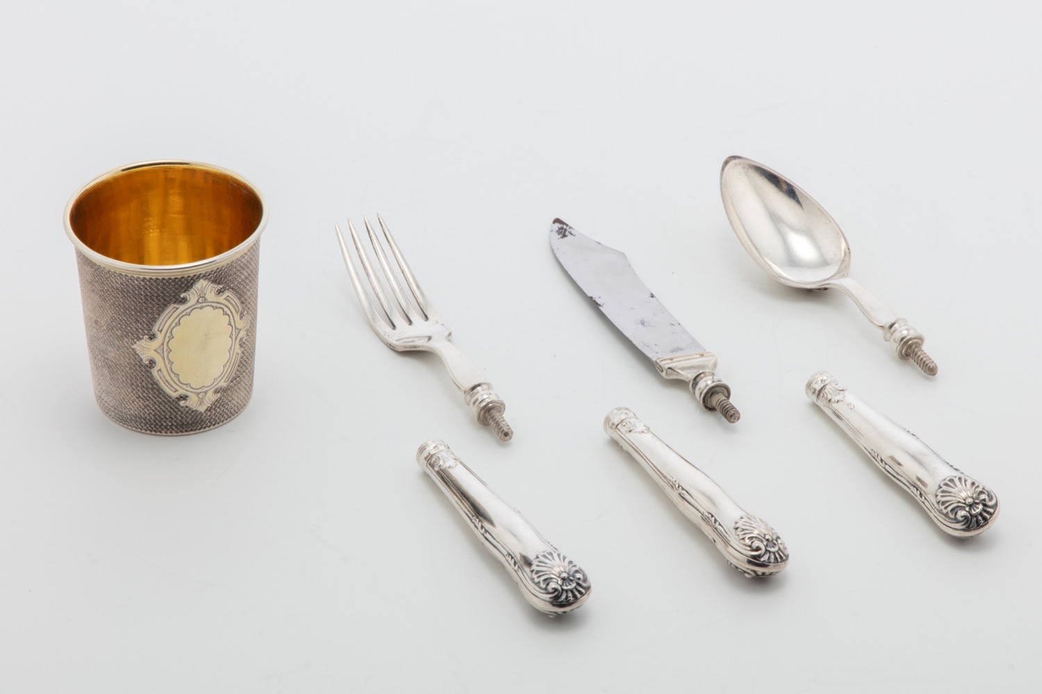 set di posate singolo da viaggio composto da un bicchiere a decoro martellato con stemma inciso e interno in vermeil, una forchetta, un coltello e un cucchiaio, (entro astuccio).