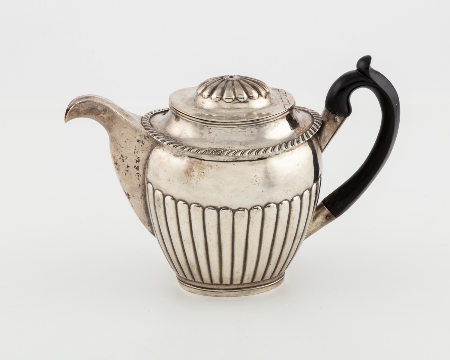 corpo baccellato, manico in legno, difetti (mancante di pomello sul coperchio).