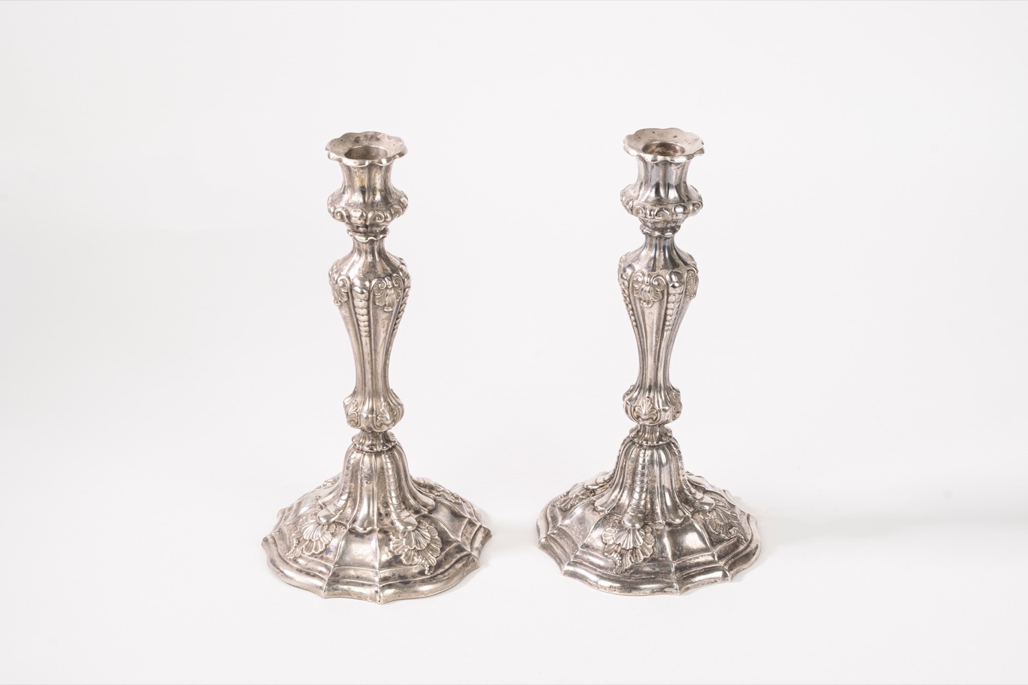 fusi e sbalzati, con decori vegetali, base a profilo mistilineo, fusto a balaustro.