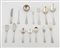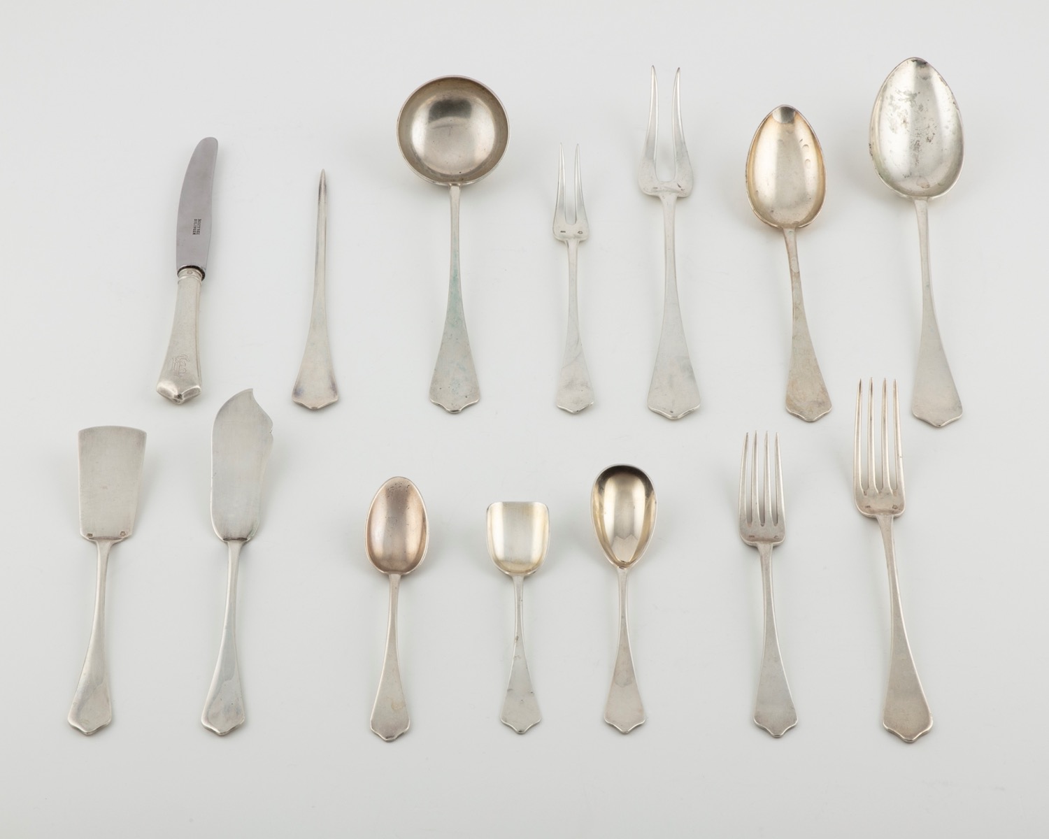 composto da 72 pezzi: 6 forchette, 11 coltelli, 6 cucchiai, 9 forchette da dessert, 12 palette da dolce, 11 cucchiai da tè, 7 cucchiaini da caffè, 10 serviti; monogrammate FF.