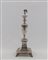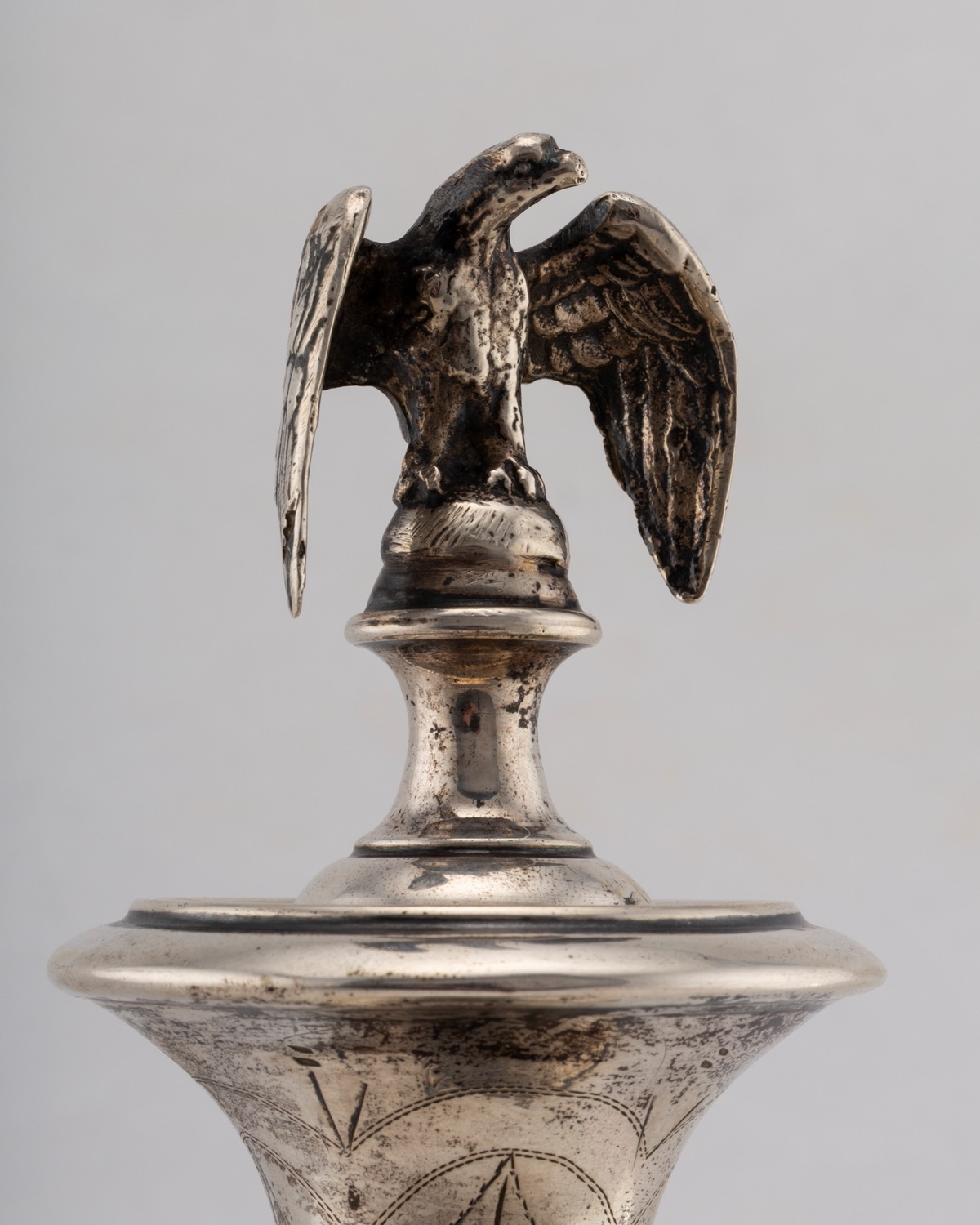 base di forma quadrata, poggiante su quattro piedini, il corpo di forma squadrata sormontato da vaso finemente inciso e cesellato, presa del coperchio a foggia di aquila, (difetti).