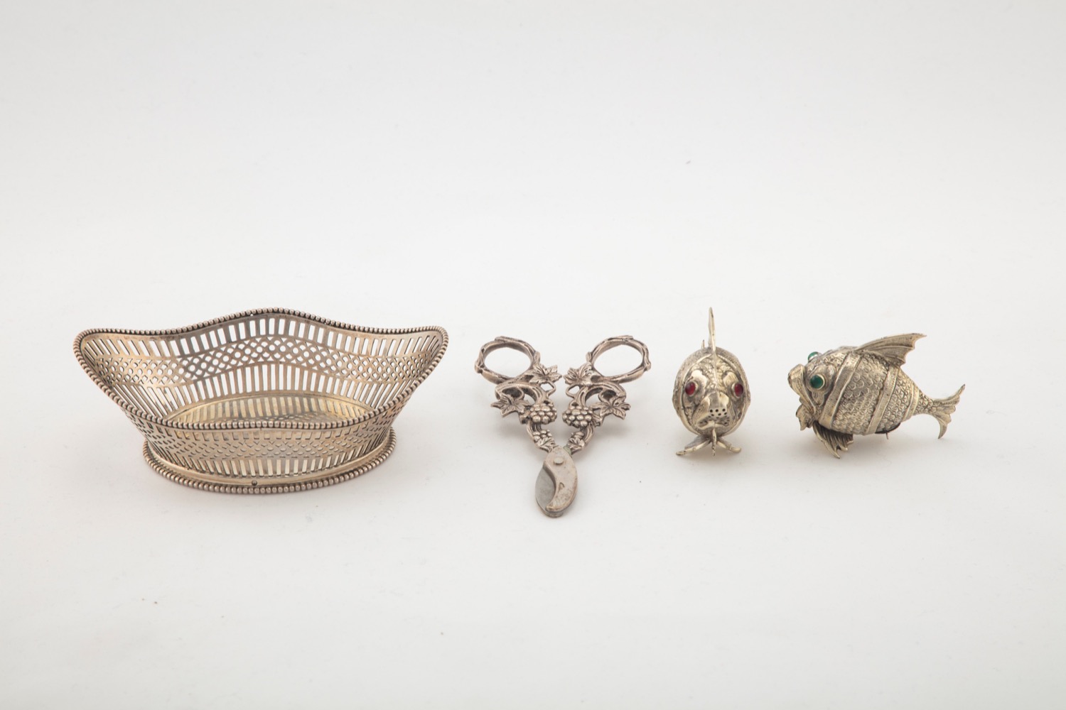 il cestino reticolato con punzone VK (Fa. J.M. van Kempen & Zoon (Son) (l cm 13,00); i sale e pepe a forma di pesciolini (l cm 6,50).