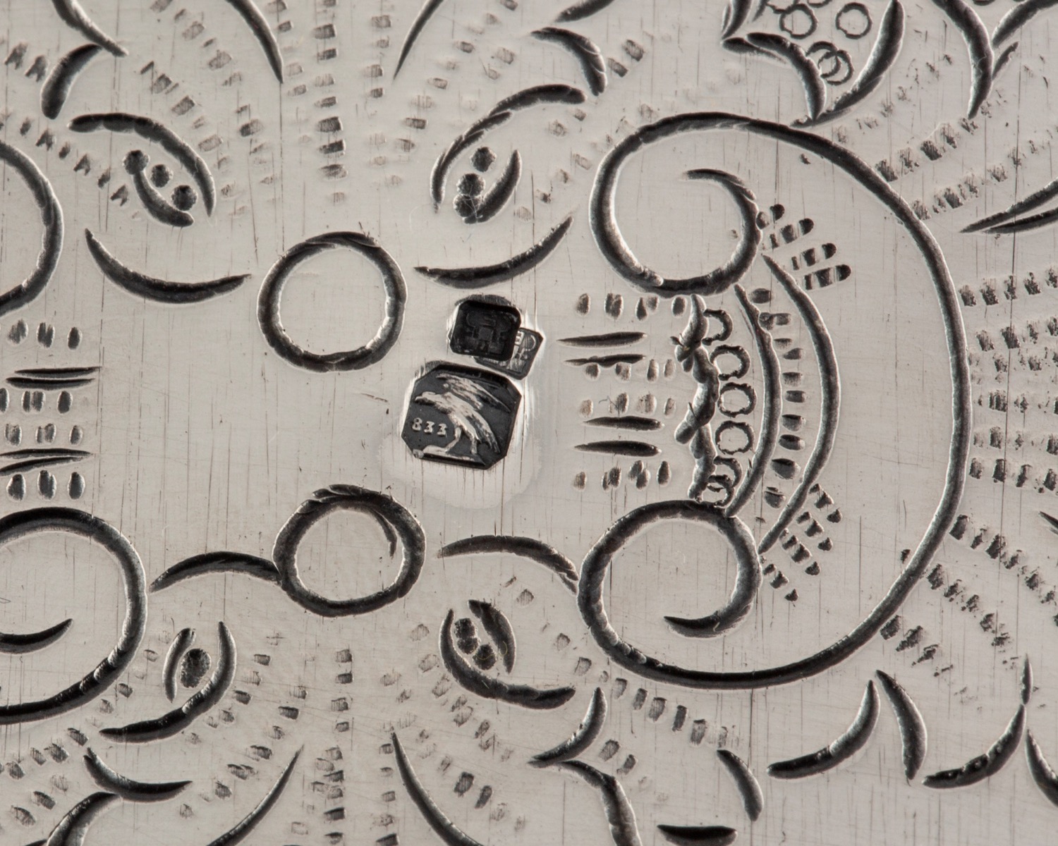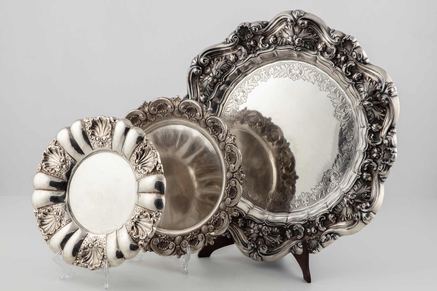 il vassoio di forma circolare, profilo mistilineo, finemente sbalzato e cesellato con motivi fogliacei e conchiglie e inciso con motivi fogliacei; i due piatti bordo a volute con decori sbalzati a rilievo con conchiglie.