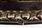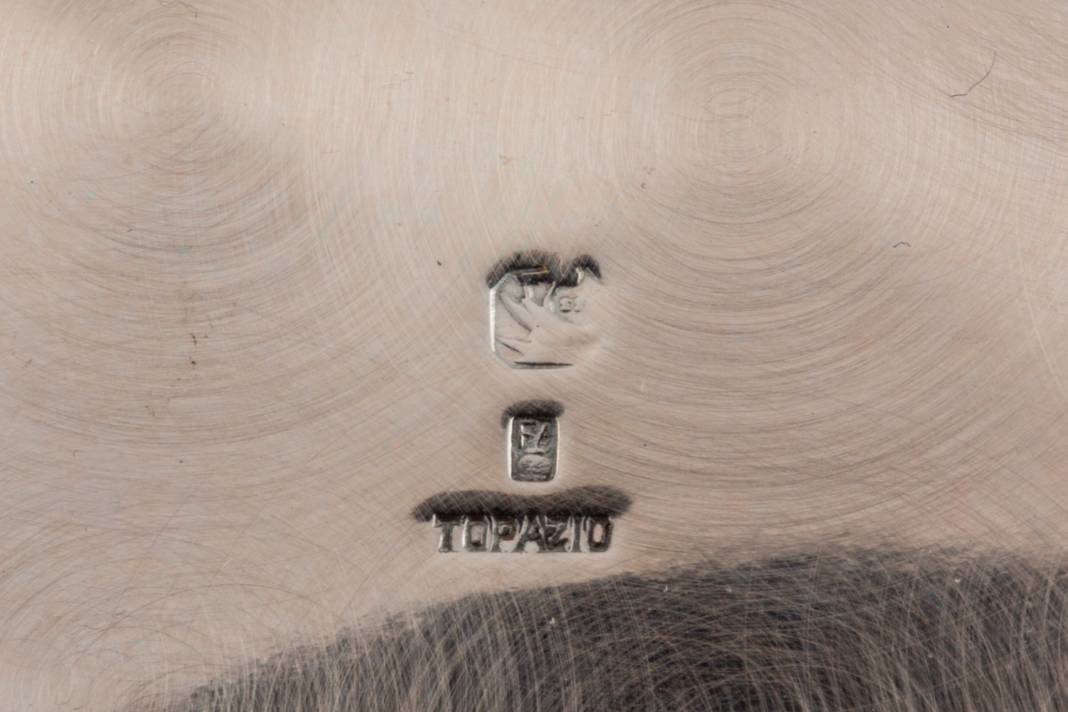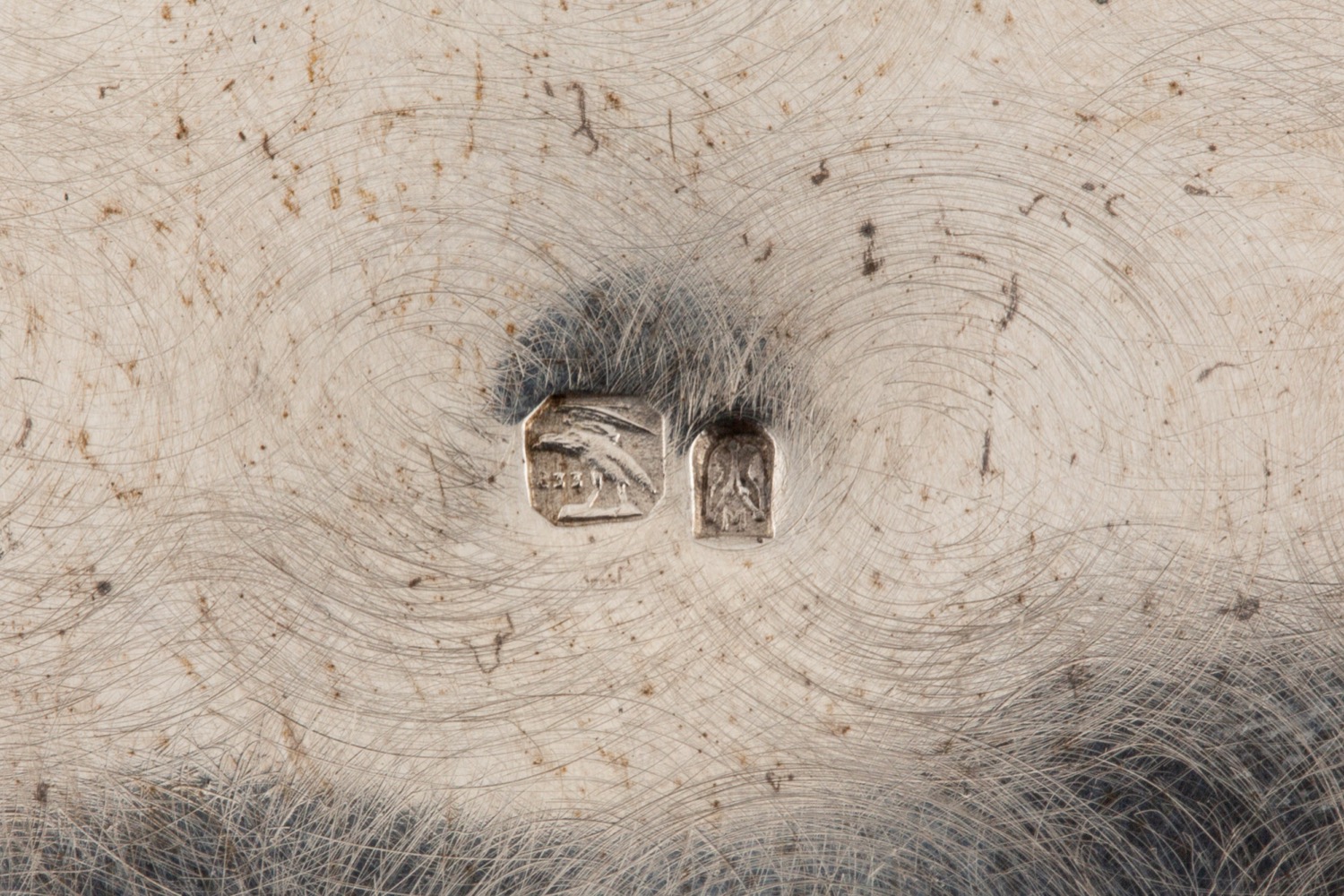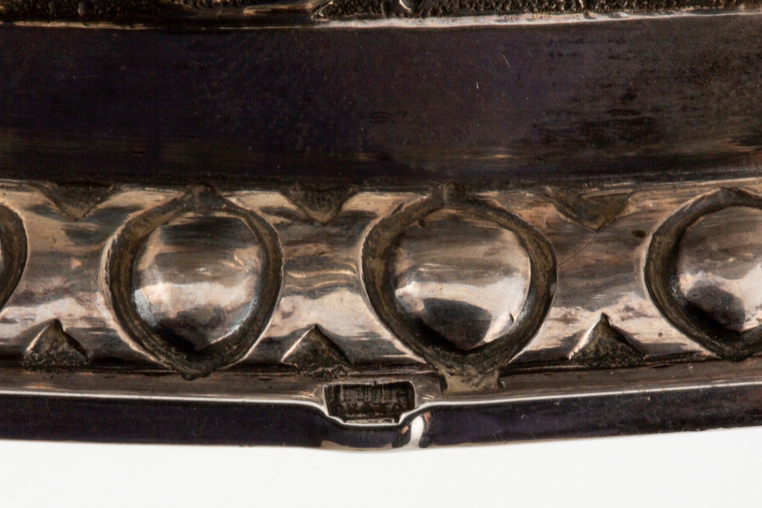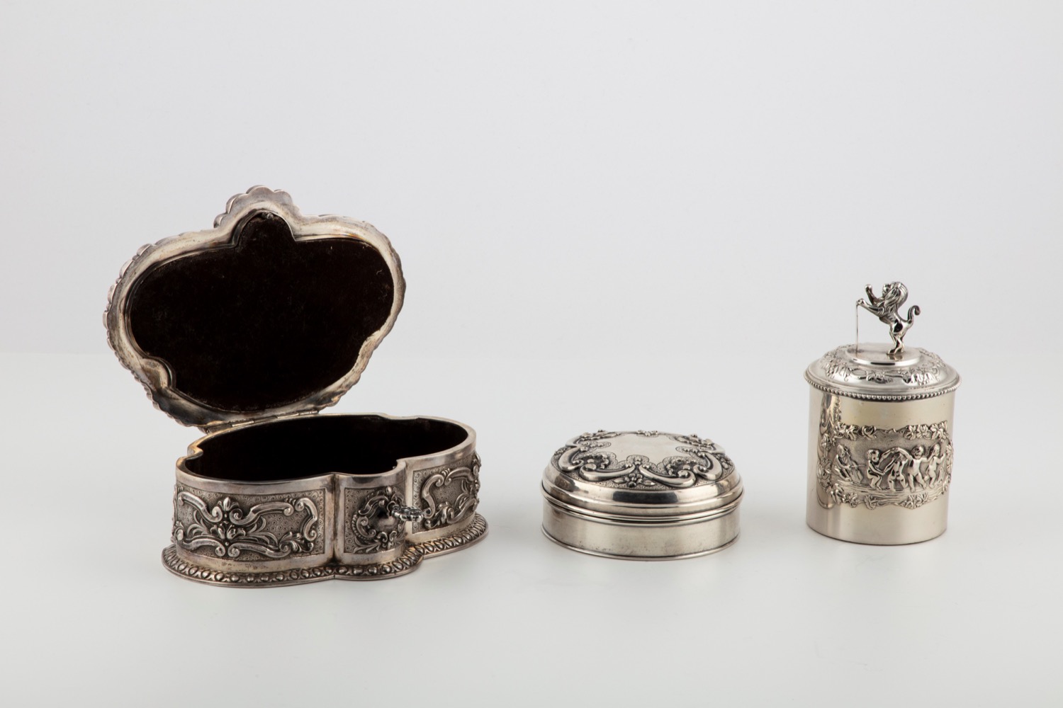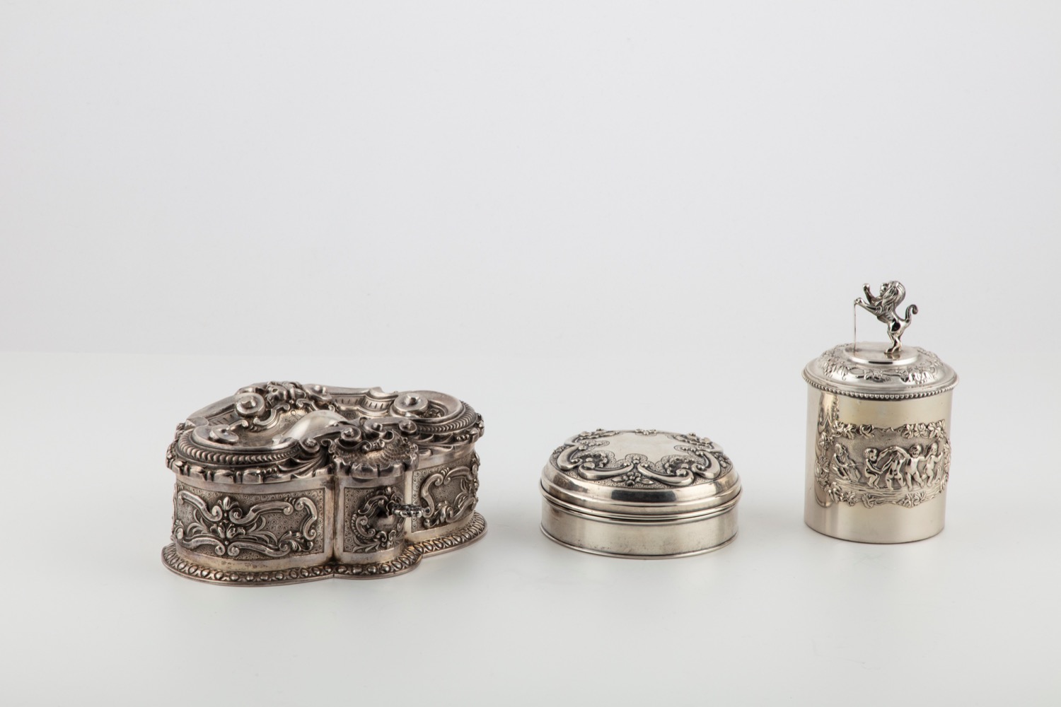 composto da scrigno riccamente sbalzato e cesellato con motivi a conchiglie e volute (interno in velluto marrone, (l cm 20,00); scatola di forma cilindrica con riserva raffigurante putti festanti e sormontata da leone a tutto tondo reggente scudo (h cm 14,00); scatola circolare con coperchio cesellato e sbalzato, interno in vermeil (d cm 11,00).
