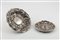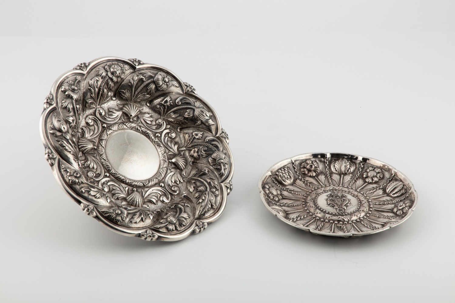 il piatto sbalzato e cesellato con riserve a motive floreali, centrato da stemma araldico del Portogallo (d cm 19,00) ; l'alzatina finemente cesellata e sbalzata a motivi floreali, conchiglie e volute (l cm 24,00).