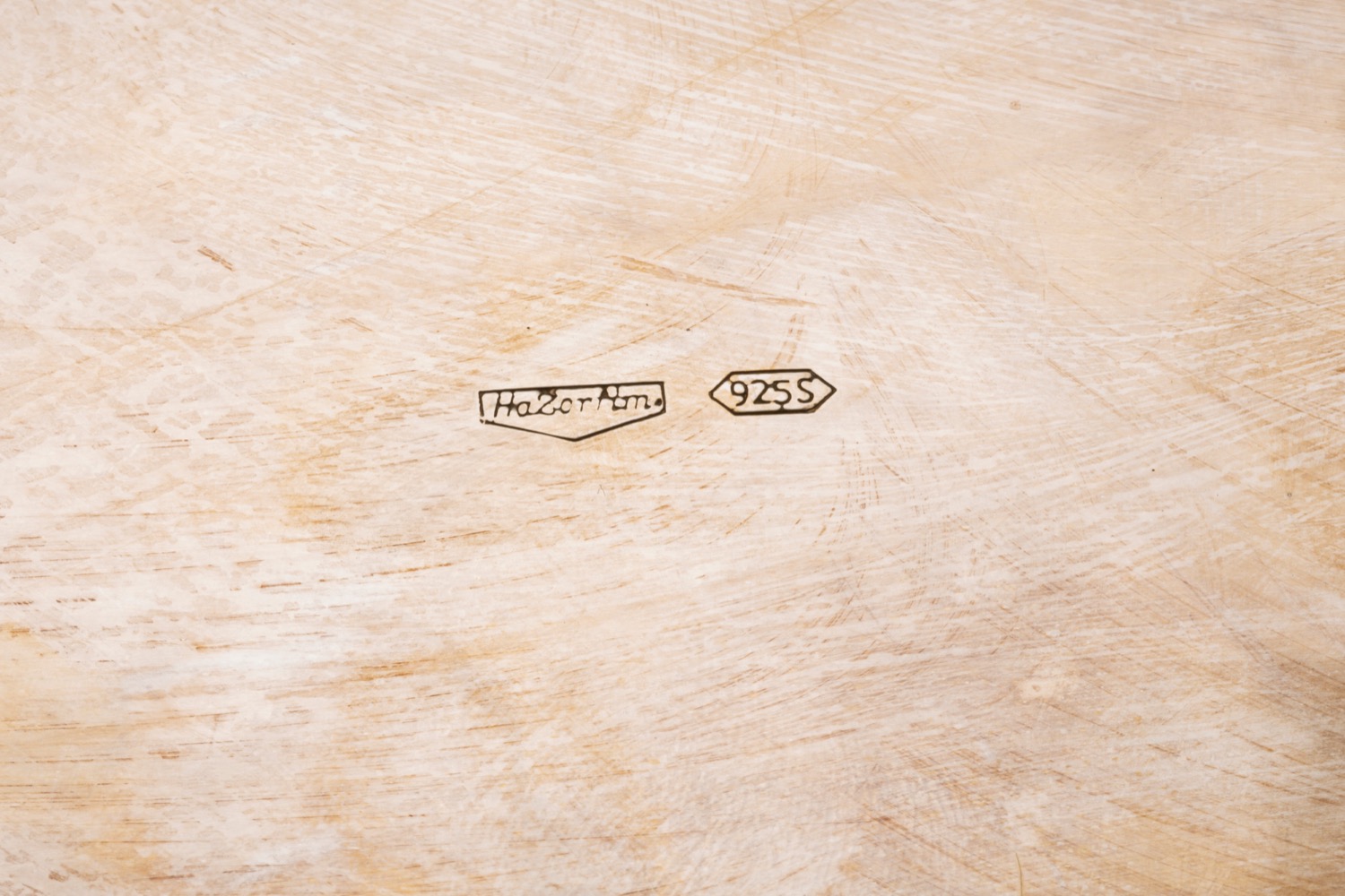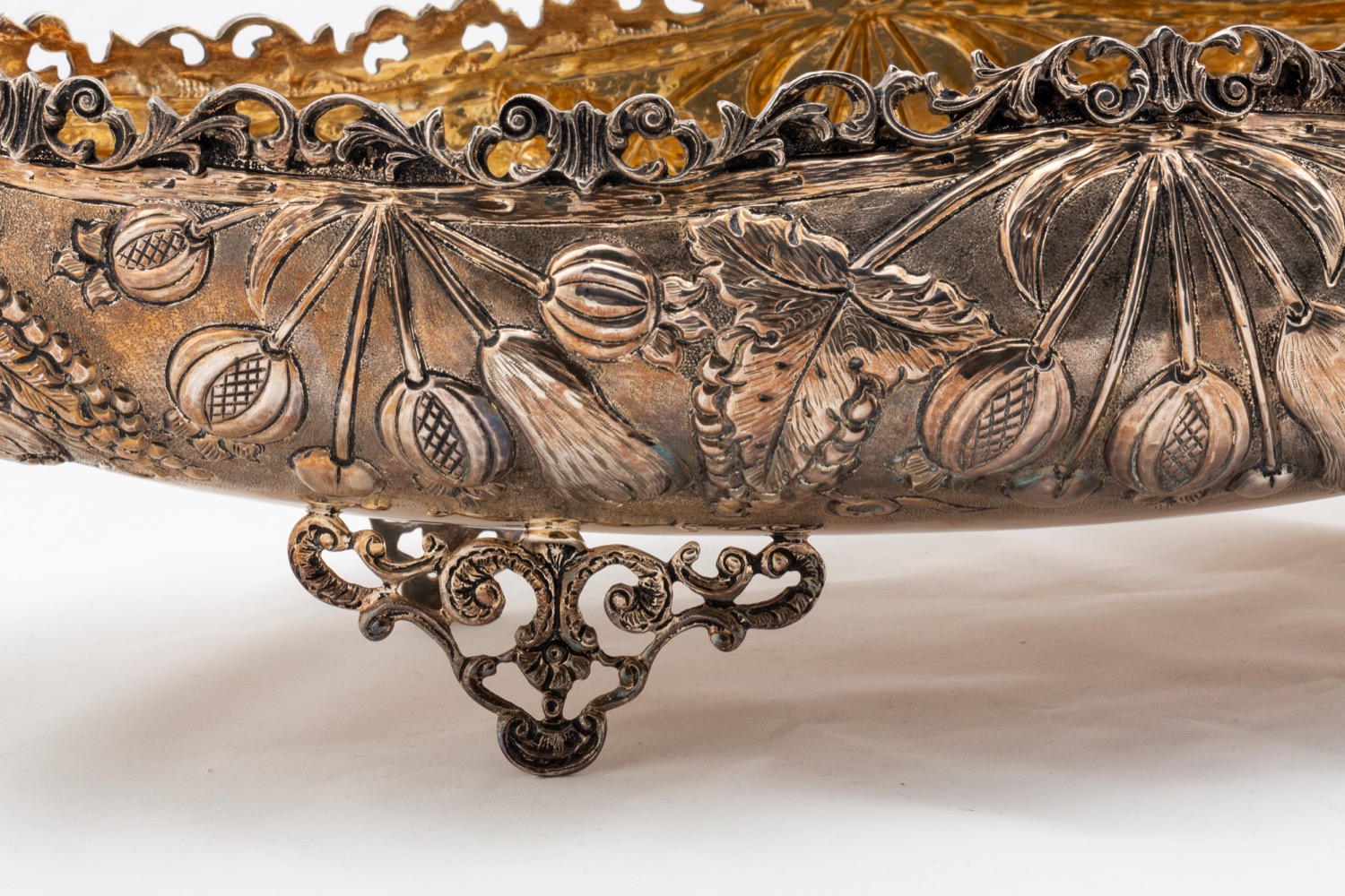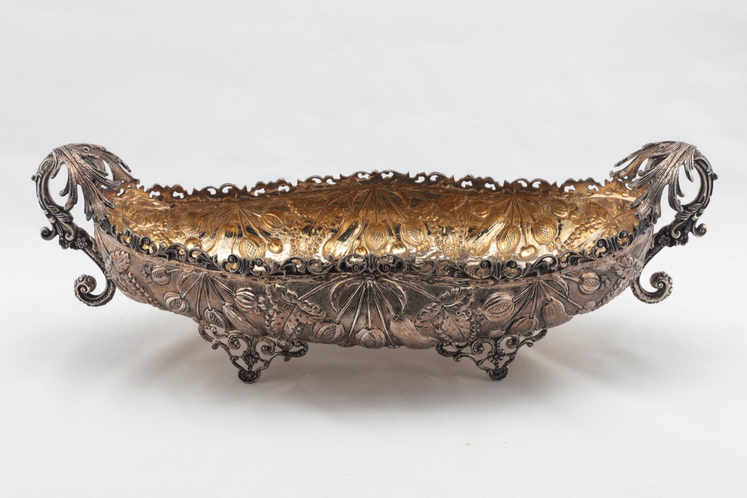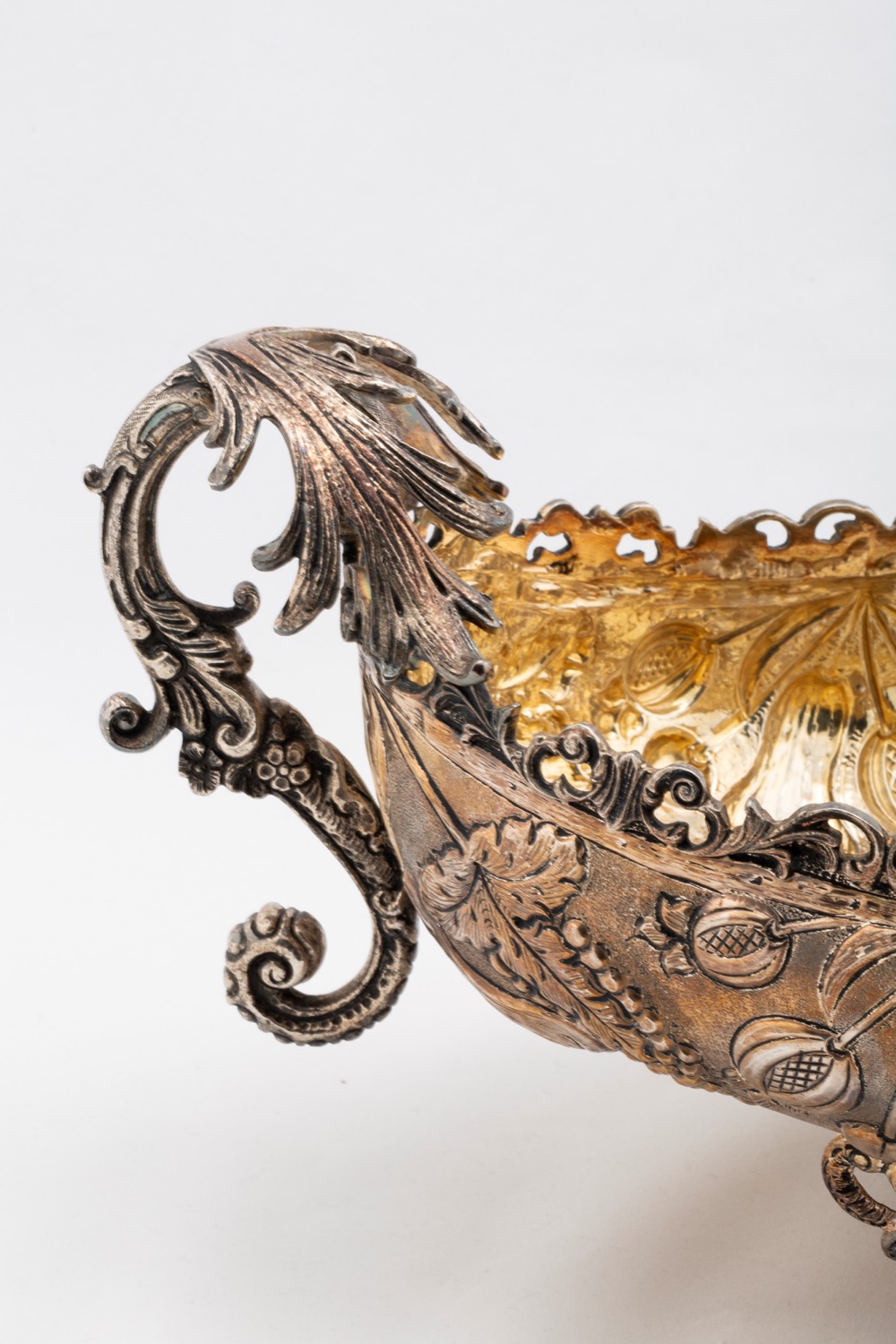 finemente cesellato e sbalzato a frutta e fiori, piedini floreali, a due anse decorate con foglie di acanto e finale a ricciolo, interno in vermeil.