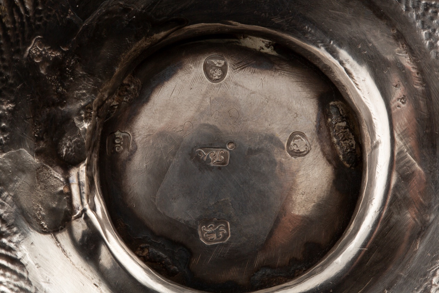 finemente cesellata, sbalzata e incisa con decori floreali, manico finemente decorato con mascheroni e foglie.