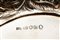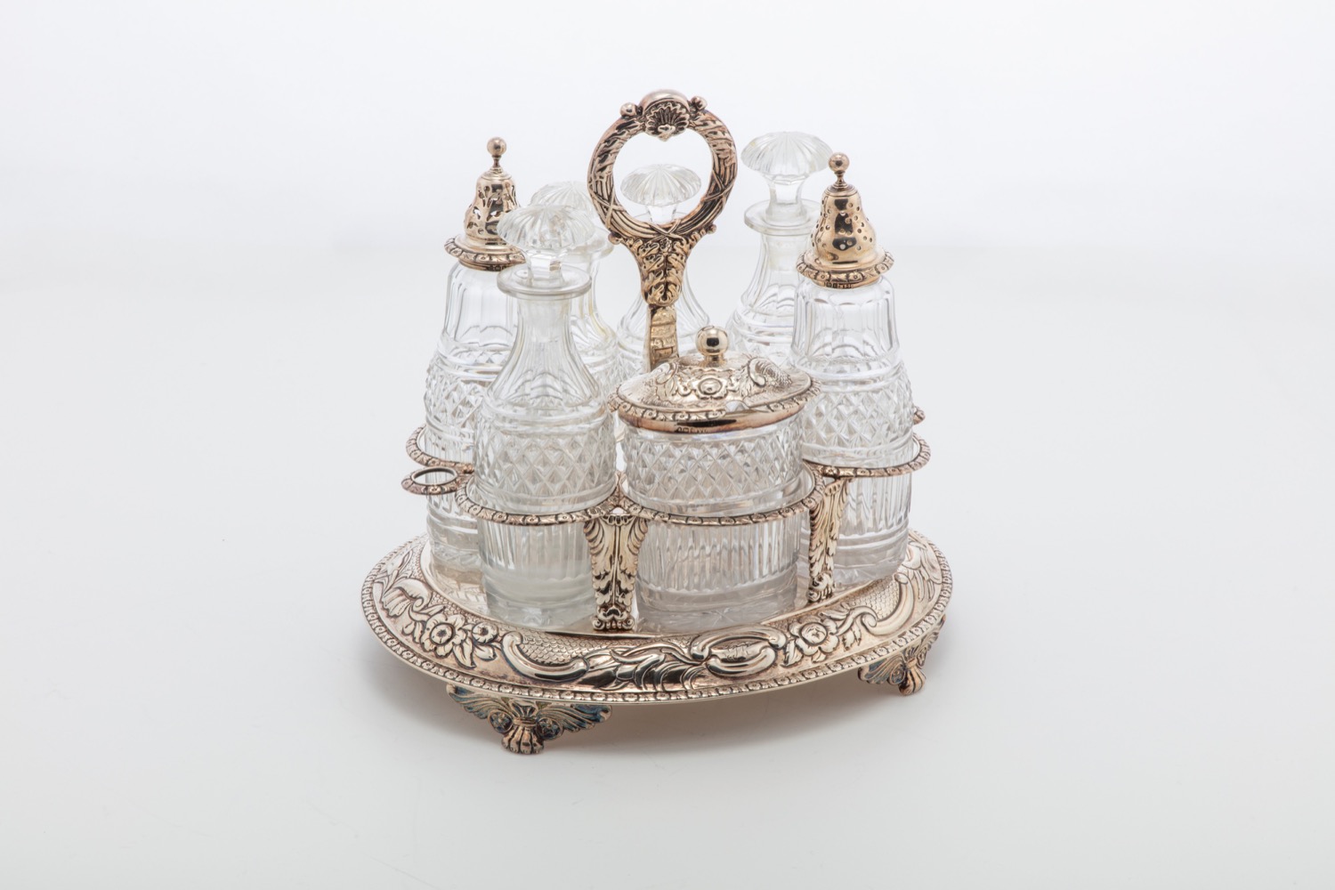 di forma ovale, poggiante su quattro piedini ferini, il corpo finemente sbalzato con fiori e motivi fogliacei, presa ad anello sbalzata terminante in conchiglia, con sette ampolle.