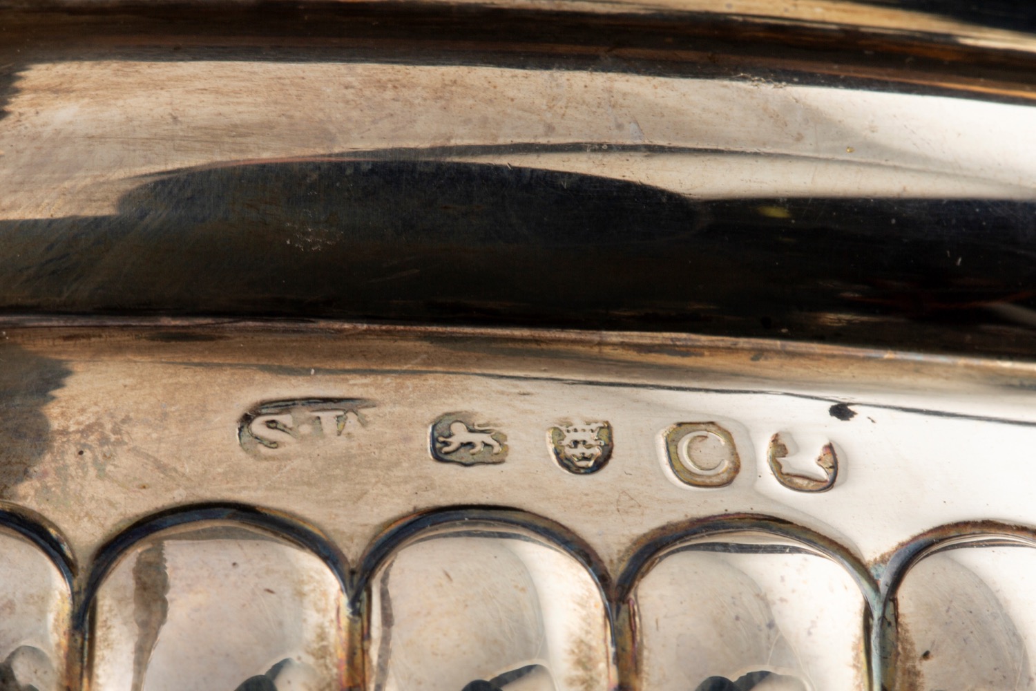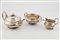 composto da teiera, lattiera e zuccheriera baccellate, poggianti su piedini a sfera e con manici a foglia d'acanto.