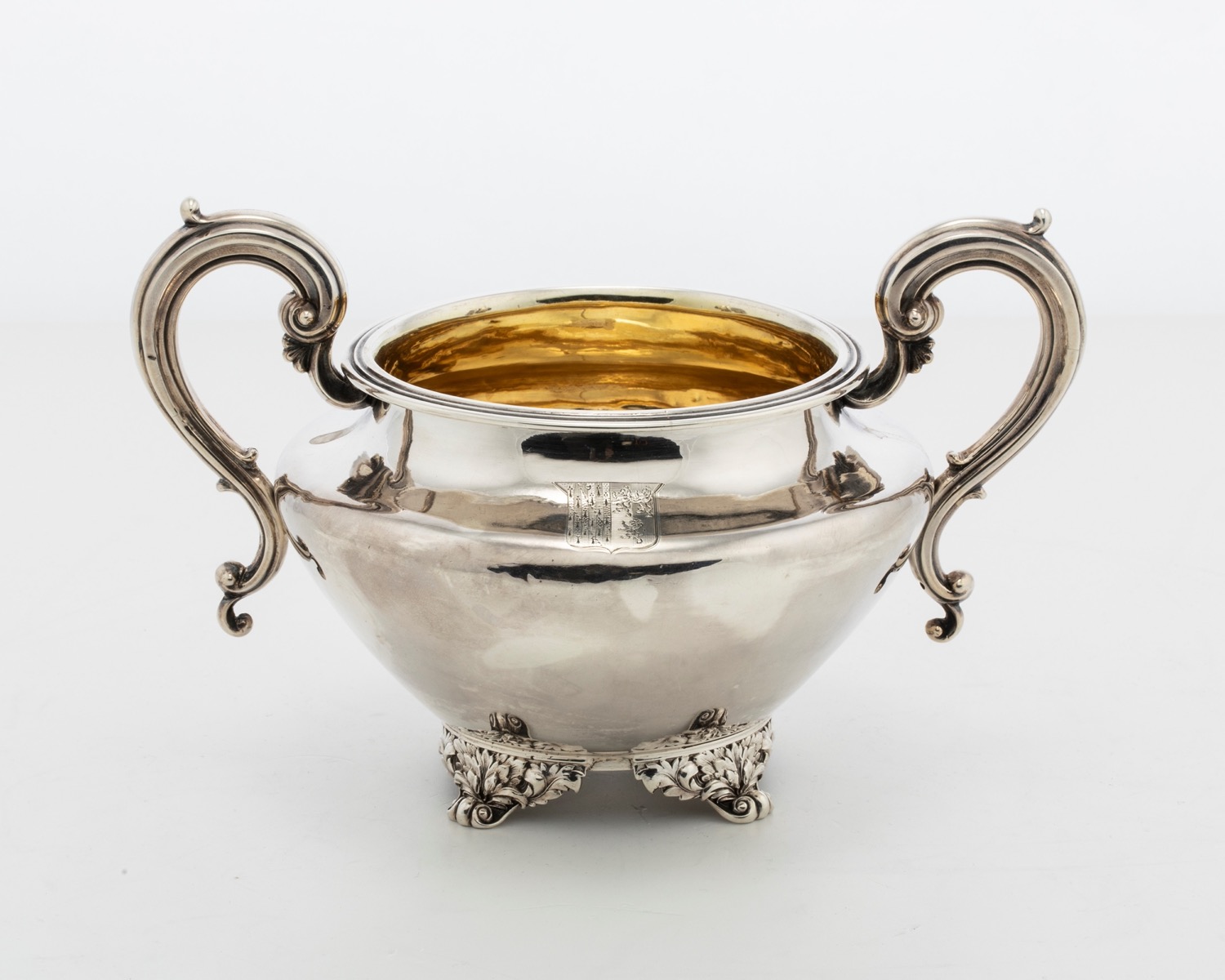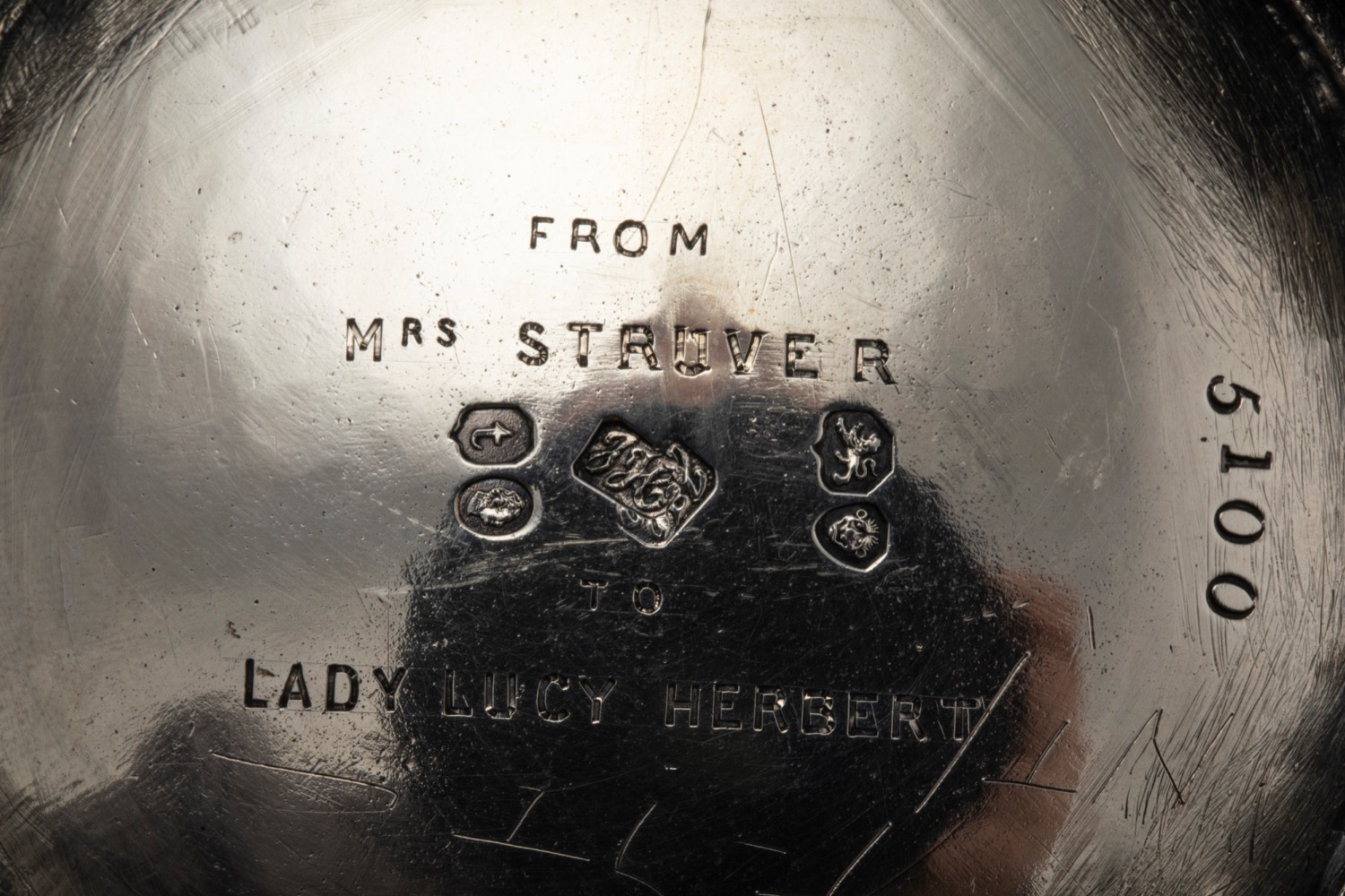 poggiante su quattro piedini a ricciolo decorati con motivi floreali, biansata, il corpo liscio con stemma nobiliare inciso; alla base reca incisione "From Mrs Struver Lady Lucy Herbert".
