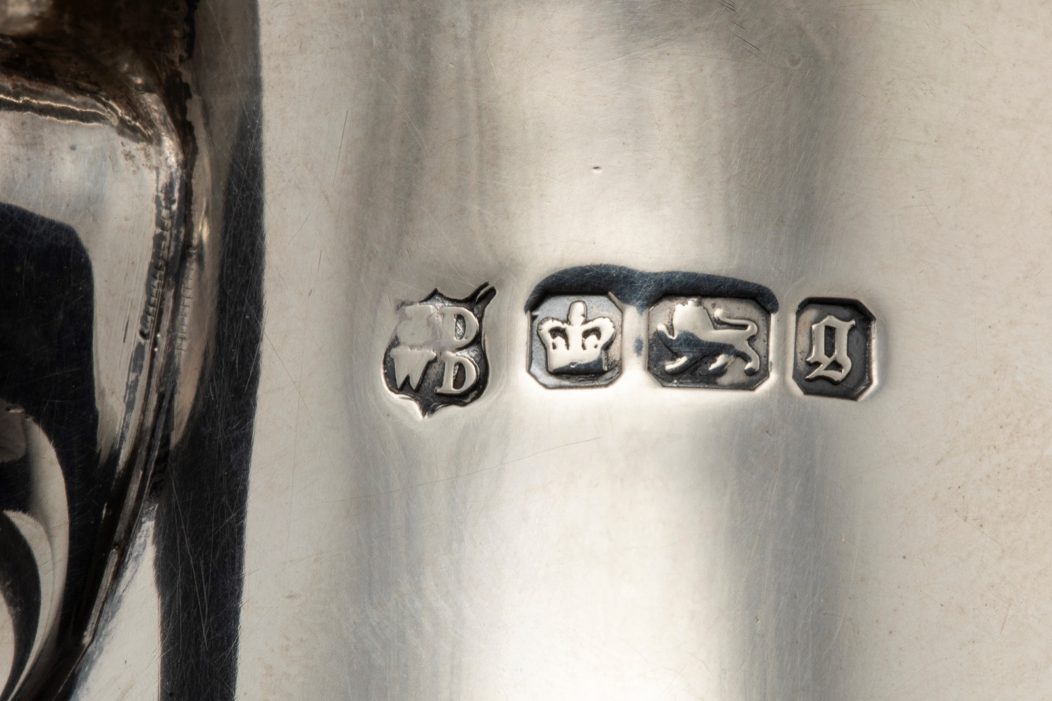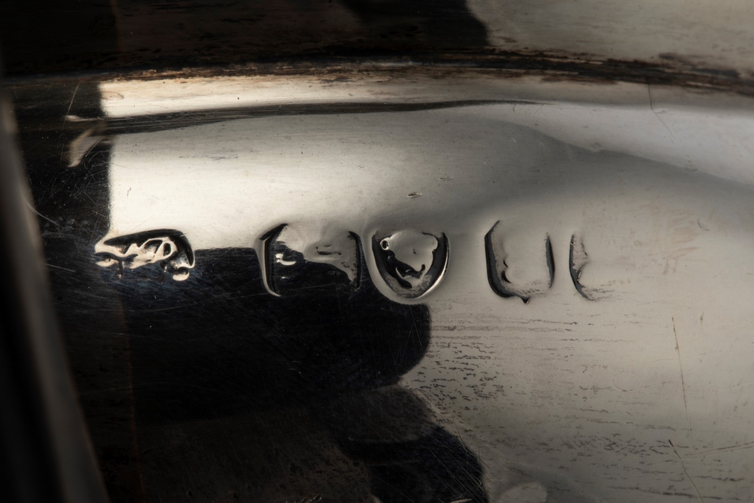 la caffettiera con punzoni dell'argentiere JDWD (John & William Deakin?), città di Sheffield 1899, corpo liscio, presa del coperchio a bocciolo e manico in legno; la teiera con punzoni dell'argentiere consunti, Londra 1822, poggiante su quattro piedini a sfera e con manico in legno.