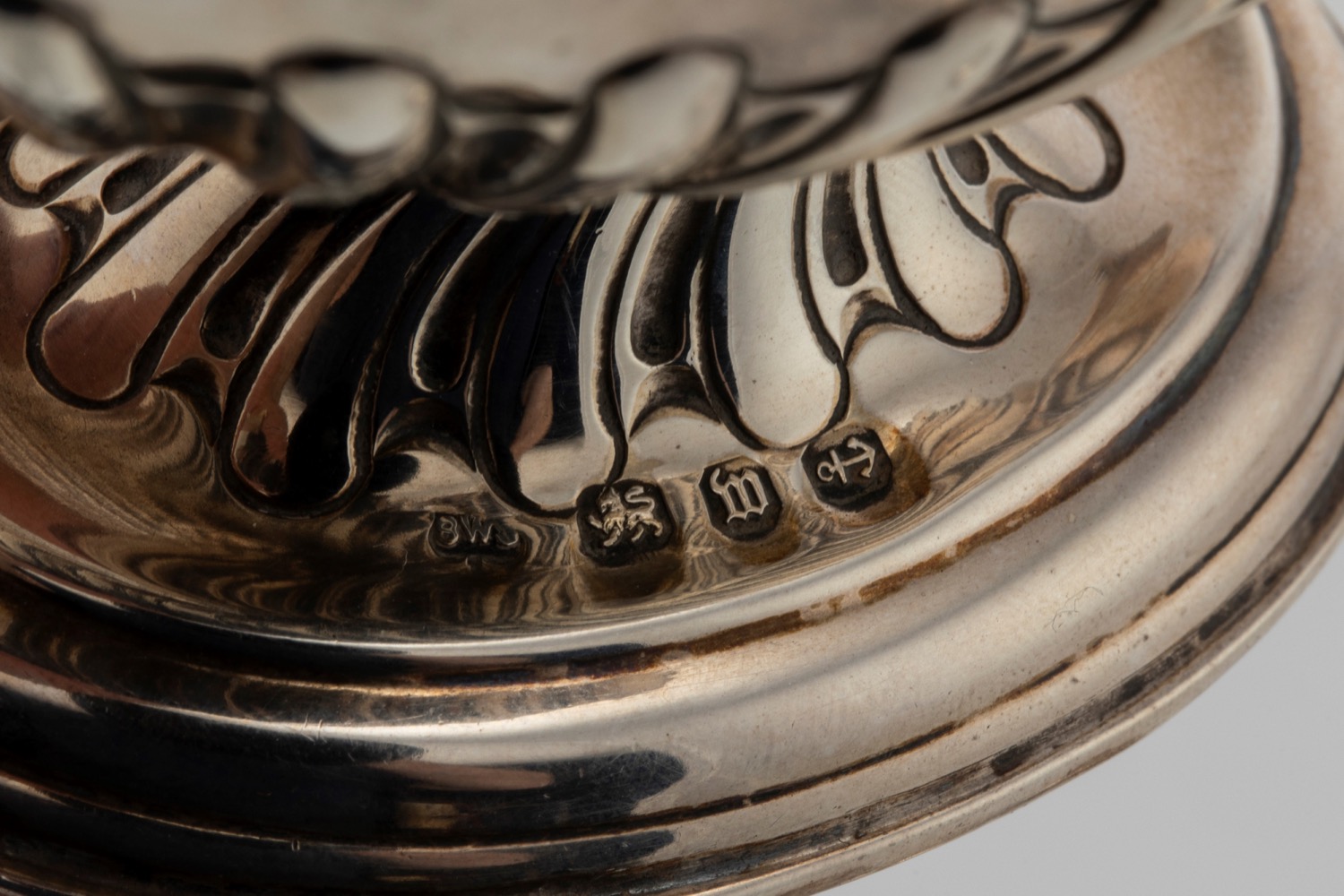 La bugia argentiere W.A (William Aitken?), Birmingham 1899; la lampada argentiere BWS (non identificato) Birmingham 1911, difetti.